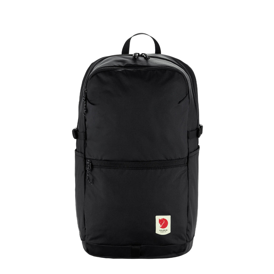 The Fjällräven High Coast Backpack 24 in Black is a versatile, lightweight daypack crafted from recycled polyamide. Designed for commuting and casual outdoor use, it features a zippered main opening, padded laptop sleeve, two front pockets, side compression straps, and a removable chest strap. A reinforced base keeps contents dry on damp ground.