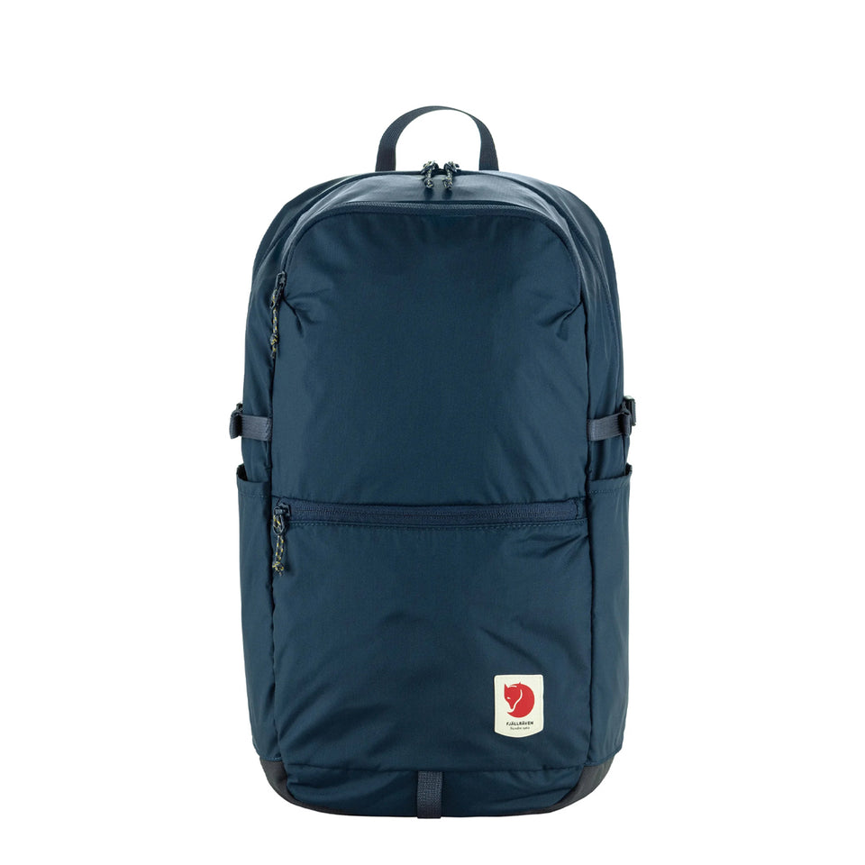 The Fjällräven High Coast Backpack 24 in Navy is a versatile, lightweight daypack crafted from recycled polyamide. Designed for commuting and casual outdoor use, it features a zippered main opening, padded laptop sleeve, two front pockets, side compression straps, and a removable chest strap. A reinforced base keeps contents dry on damp ground.