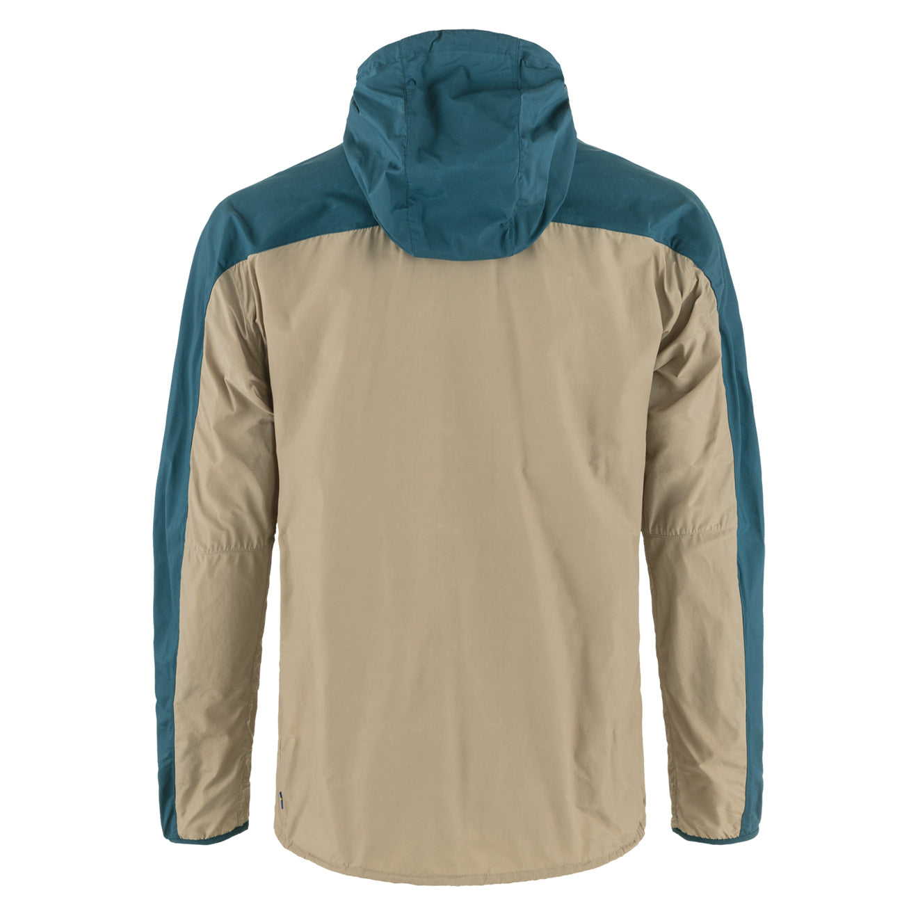 The Fjallraven High Coast Wind Jacket in Fossil / Deep Sea is a Light, pliant and packable wind jacket in waxed polyamide/organic cotton. A practical jacket for many kinds of outdoor life – hiking, paddling or cycling. Adjustable hood and three zippered pockets for small items. Sleeve cuffs with elastic edging. Waxed to make the jacket water-resistant in light rain.