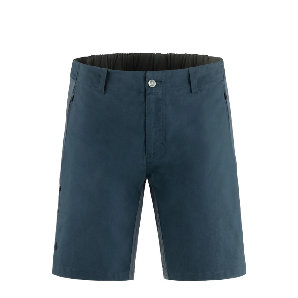 The Fjällräven Hoja Hybrid Shorts in Navy are designed for ultimate comfort both on and off the bike. Made from a blend of G-1000 Lite Stretch and 4-way stretch fabric, these lightweight, breathable shorts offer excellent freedom of movement, fast-drying properties, and great ventilation. Perfect for cycling and other outdoor activities, they feature reflective details on the inside of the hems, which can be exposed by folding up the cuffs for added visibility.