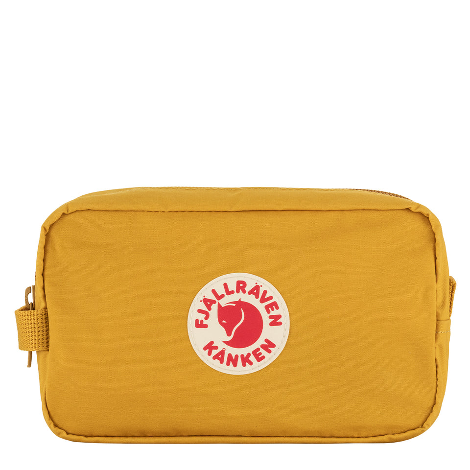 Fjallraven Kanken Gear Bag in Ochre. Kånken Gear Bag is a versatile pack bag for everything from all your cords and tools to your skin products and other items you want to keep organised. The main compartment has a durable zipper and there is a handle/hang loop on the side. Two open pockets inside. Pack volume 2 litres, measurements 12 x 19.5 x 6.5 cm.