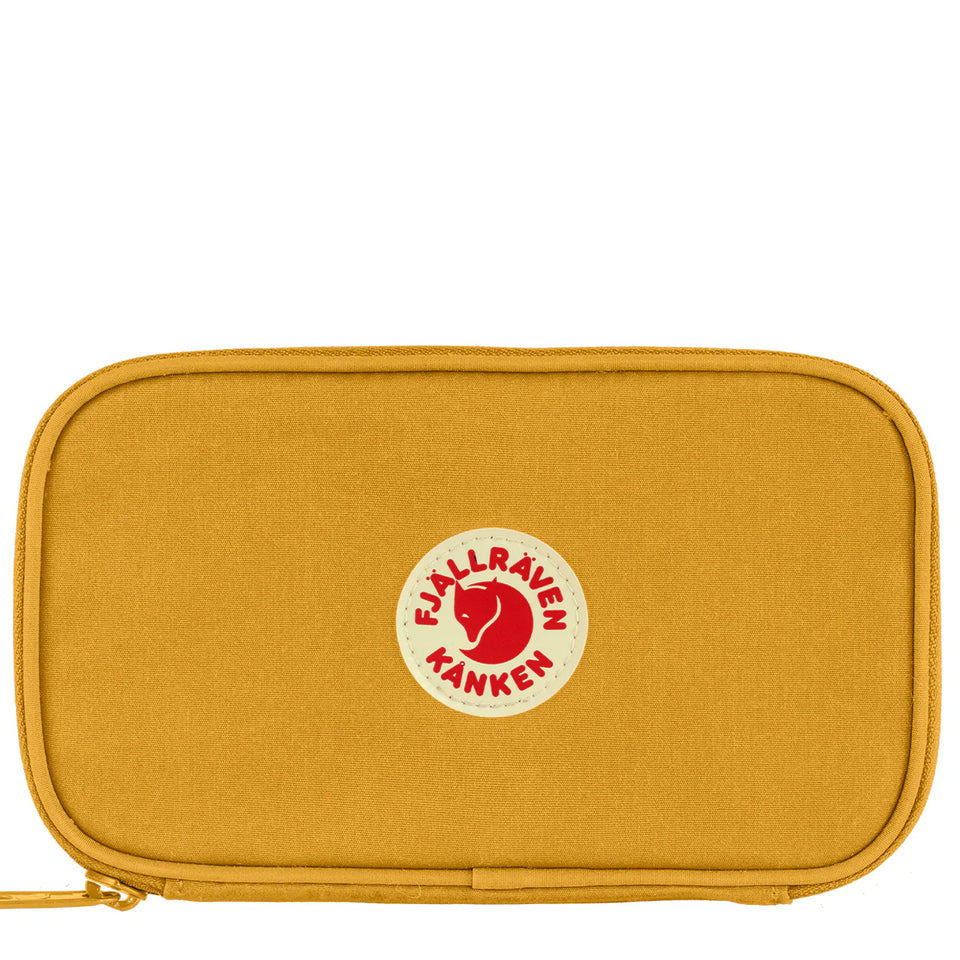 Fjallraven Kanken Travel Wallet in Ochre. Spacious wallet for your passport, travel documents, phone, bank notes etc. Made from G-1000 HeavyDuty S with an outside flat pocket for your boarding pass and documents you want close at hand before departure. Part of Kånken Essentials, a series of smart accessories for outdoor life, travel and everyday use.