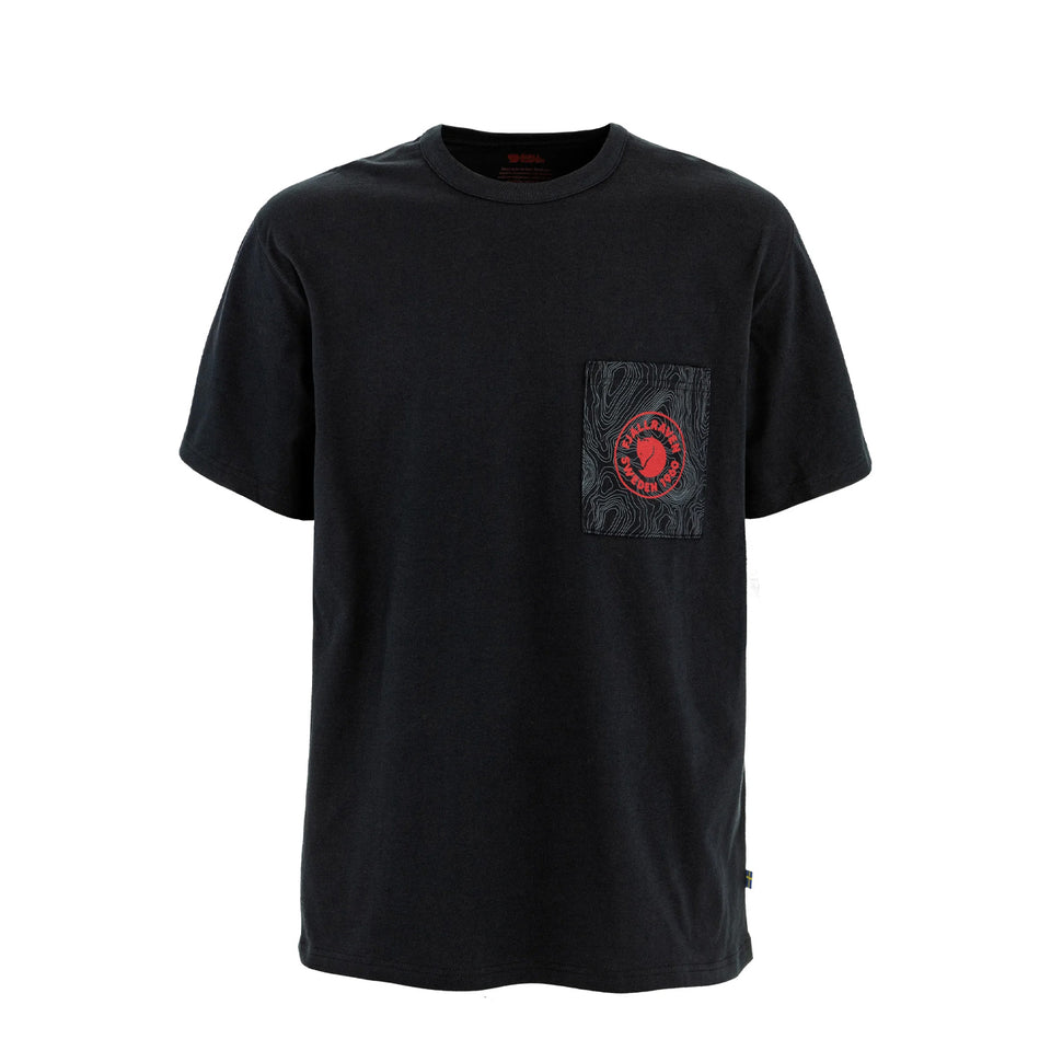 The Fjällräven Logo Pocket T-Shirt in Black is made from heavy organic cotton jersey that feels substantial yet breathable. It features a chest pocket printed with a topographical design and the classic Fjällräven 1960 logo.