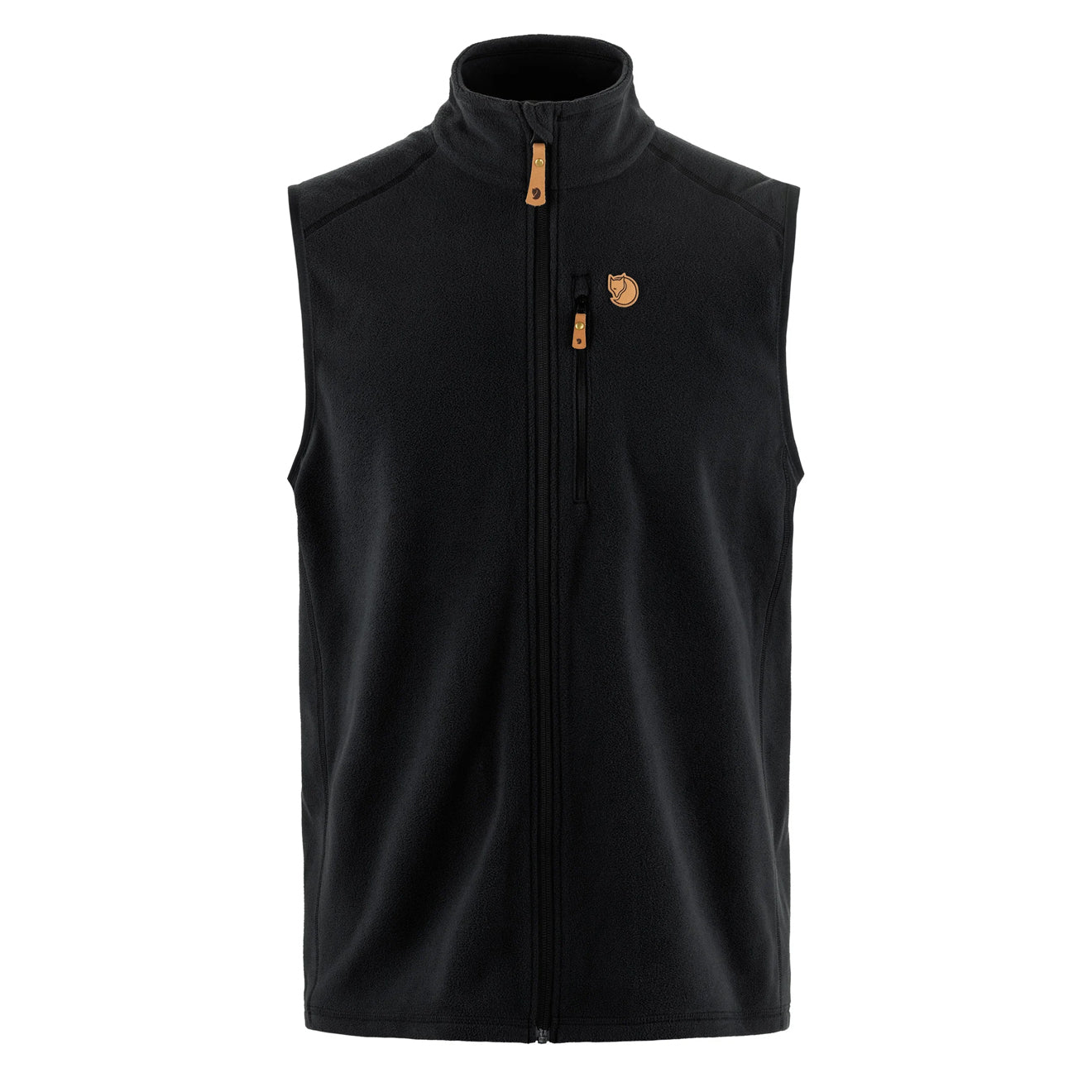 Fjallraven Ovik Lite Fleece Vest Black. Lightweight vest in microfleece made from recycled polyester for everyday outdoor life. Övik Lite Fleece Vest for men is a great layering garment that can also be worn on top of a t-shirt in the springtime or on summer evenings. Timeless design with carefully placed seams to reduce the risk of chafing under a backpack. Zippered chest pocket, full-length front zipper and elastic binding at armholes.
