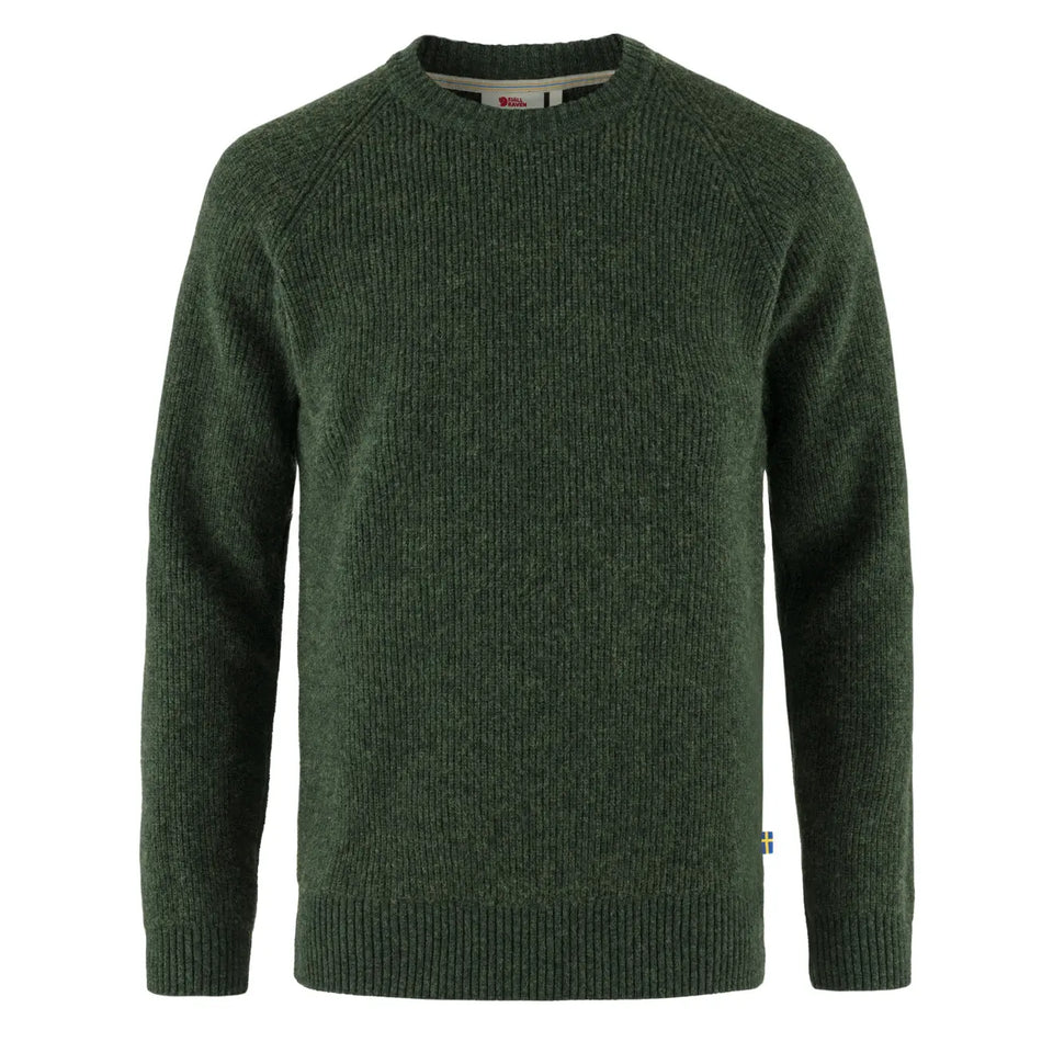 A classic round-neck sweater made from traceable wool. Knitted in a half-cardigan stitch for great insulation and raglan sleeves for comfort and freedom of movement. Ribbed neckline, cuffs and hem. Leather fox logo on sleeve. A fantastic timeless garment perfect to wear year round for everyday activities.