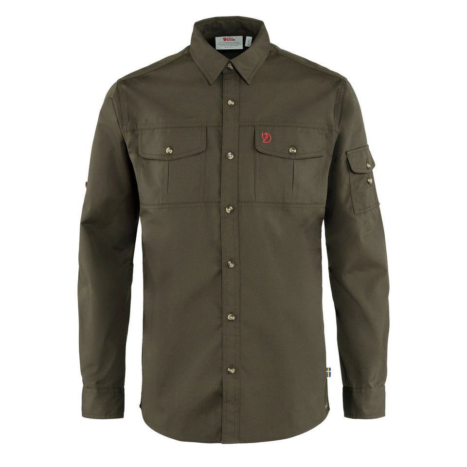 The Fjallraven Singi Trekking Shirt in Dark Olive has a regular fit and is designed for the demanding outdoor lifestyle. Constructed from pre-washed, unwaxed G-1000 fabric, this shirt provides a soft touch against the skin. Its moisture-wicking properties and quick-dry technology ensure maximum comfort during high-intensity activities. Ventilation openings with net fabric under the arms and in the yoke across the shoulders release any excess heat. This shirt also features two chest pockets and an arm pocket, all with buttoned flaps, and sleeve buttons to keep rolled up sleeves in place.