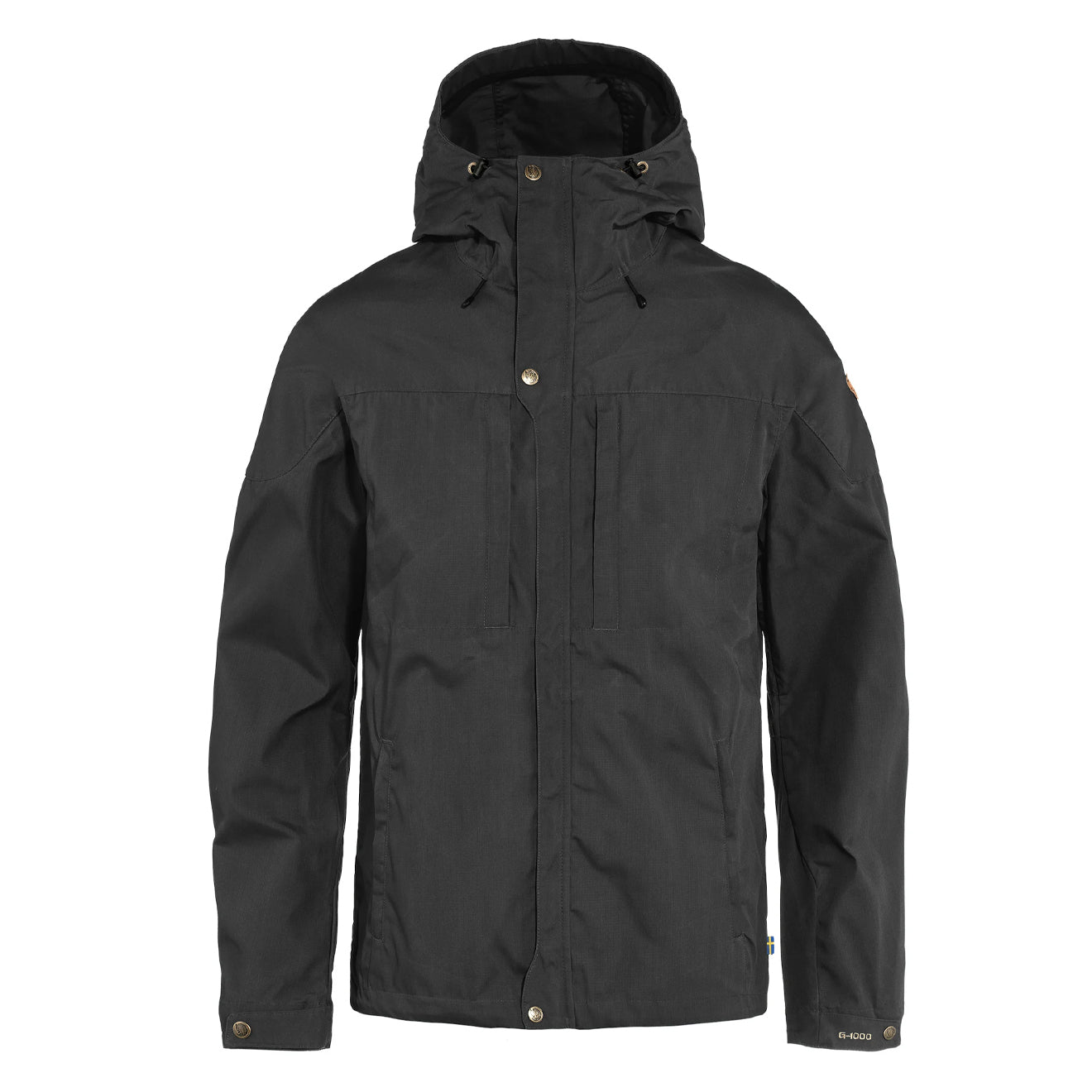 The Fjallraven Skogso Jacket in Dark Grey is a hip-length outdoor jacket, slightly longer at the back, with a fixed, adjustable hood. Made from G-1000 Lite with extra reinforcement on the shoulders and hood, it offers wind and light rain protection while allowing good ventilation.