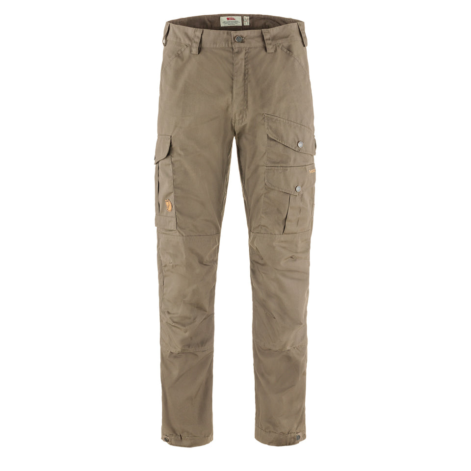 Fjallraven Vidda Pro Reg Leg Trousers in Suede Brown are durable trekking trousers for adventures in the mountains and forest. Made from durable wind and water-resistant G-1000 fabric with double layers over the rear and knees. Regular waist (mid waist) and regular fit with pre-shaped knees. Six practical pockets including a map pocket and a multitool pocket. Elastic strap adjustments with press buttons on leg endings. Available in three lengths; short, regular and long.
