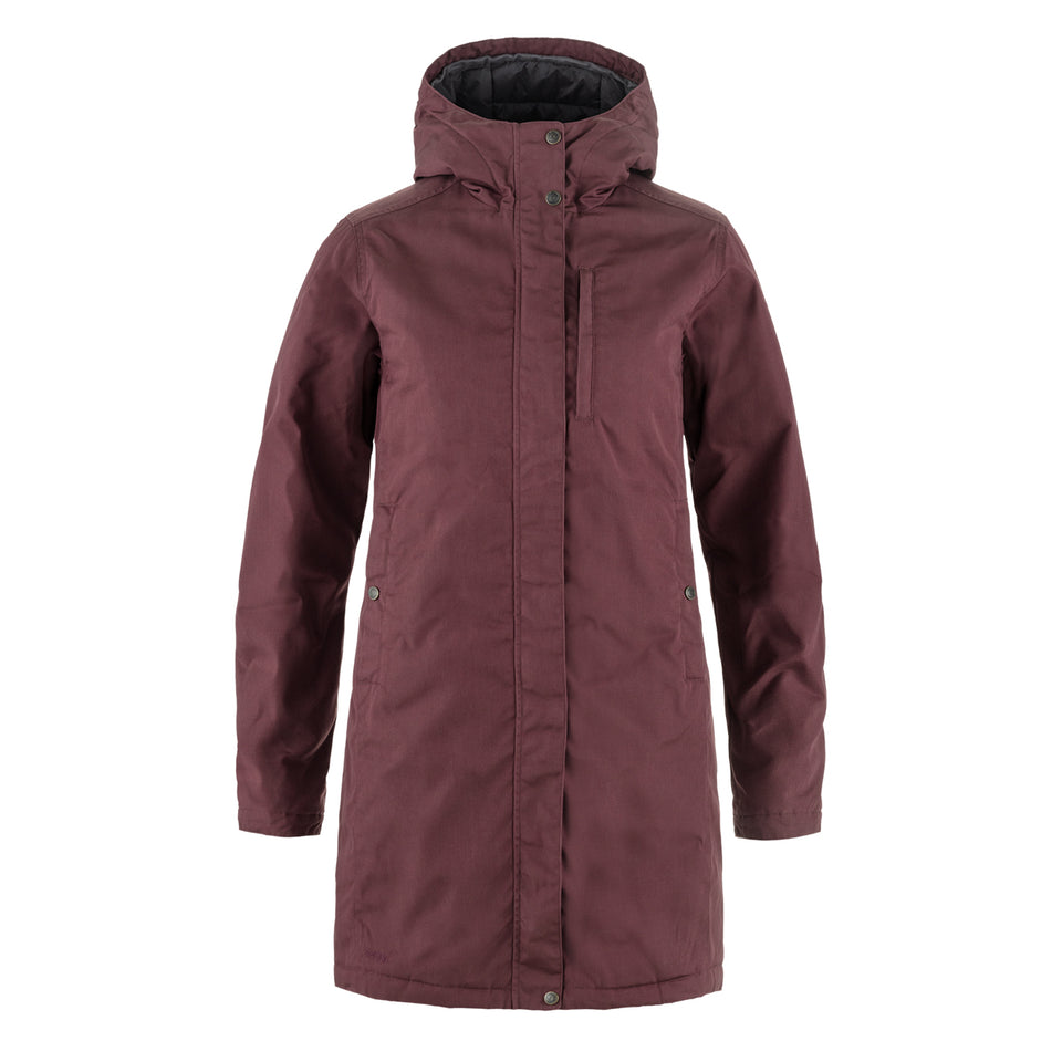 The Fjällräven Women's Kiruna Padded Parka in Port is a warm, durable, and stylish choice for cold-weather days. Made from wind- and water-resistant G-1000 fabric with synthetic insulation, it offers reliable warmth even in damp conditions. Its long design, fixed hood, two-way zipper, and practical pockets ensure comfort and functionality, making it perfect for everyday wear or outdoor adventures.