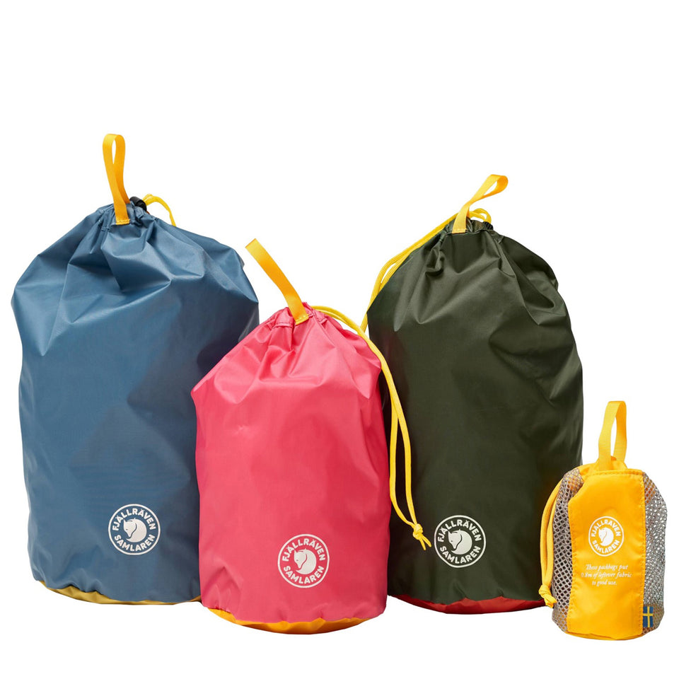Fjallraven x Samlaren Pack Bags Assorted is a set of four lightweight packbags to help you organize your gear inside your backpack, now in a new round design. Sizes are 0.5L, 4L, 5.5L and 8L and the different colours make differentiation quick and easy. Drawcord closures with cord-lock and webbing loop on top. Contrasting colour on the base. The smallest bag is half mesh and functions as a packbag for the set when not in use. Part of the Samlaren series of products created from leftover fabrics.