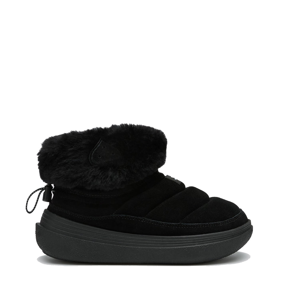 Suede ankle boot featuring cozy shearling lining, leather insole, and durable rubber sole with contrast tread for added grip.