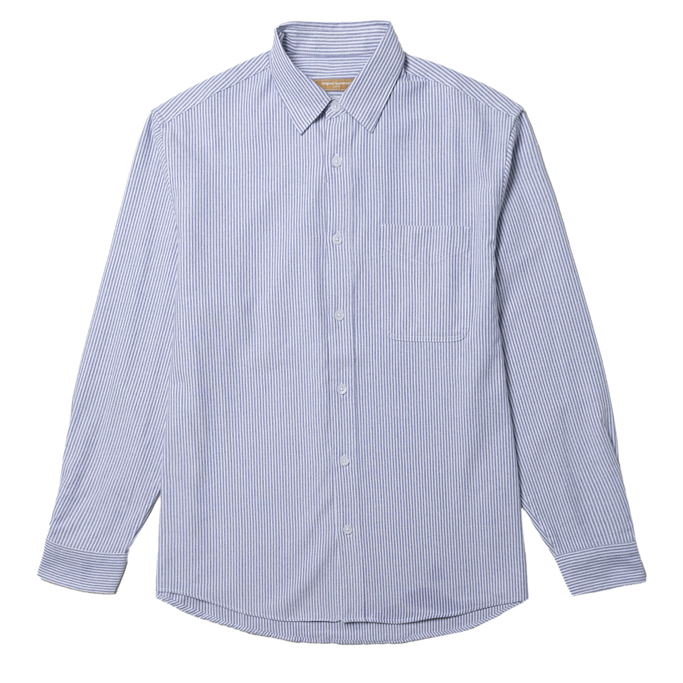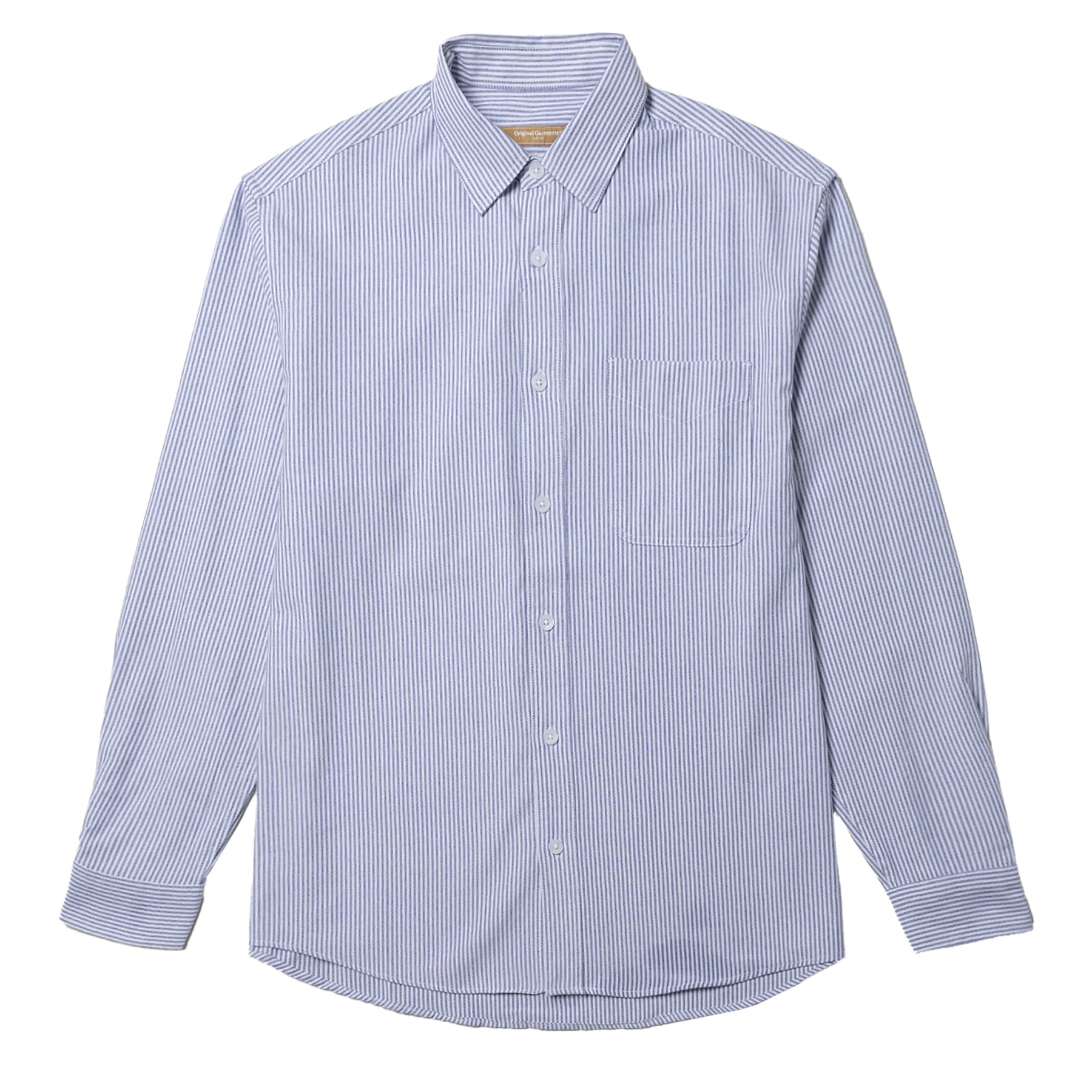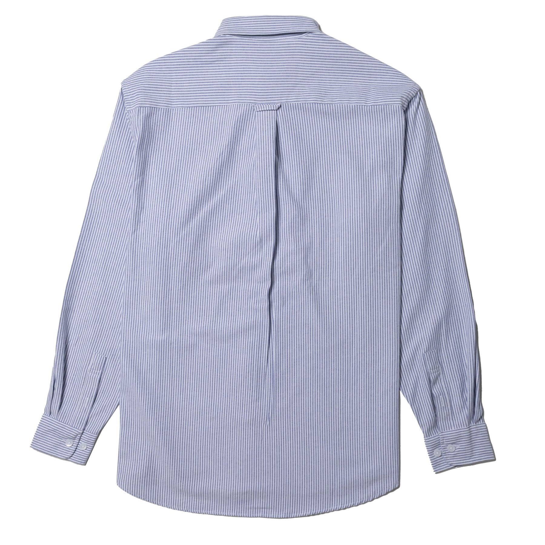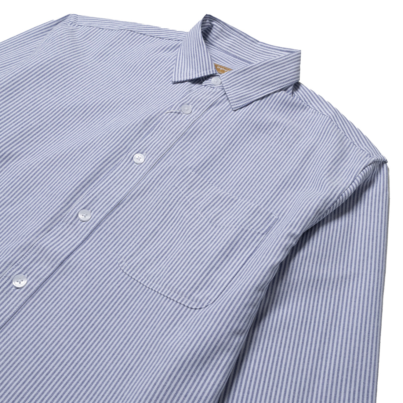 The Frizmworks OG Stripe Seersucker Shirt in Blue is a standout piece from the brand’s “Original Garments” line, its premium basics range refined since 2010. Crafted in Korea from a durable cotton-polyester seersucker blend (60/40), it features a subtle hickory stripe and a small flap-down collar. Designed with a boxy, slightly oversized fit and classic button-down silhouette, this shirt delivers everyday comfort with long-lasting quality. For a relaxed look, we recommend taking your regular size