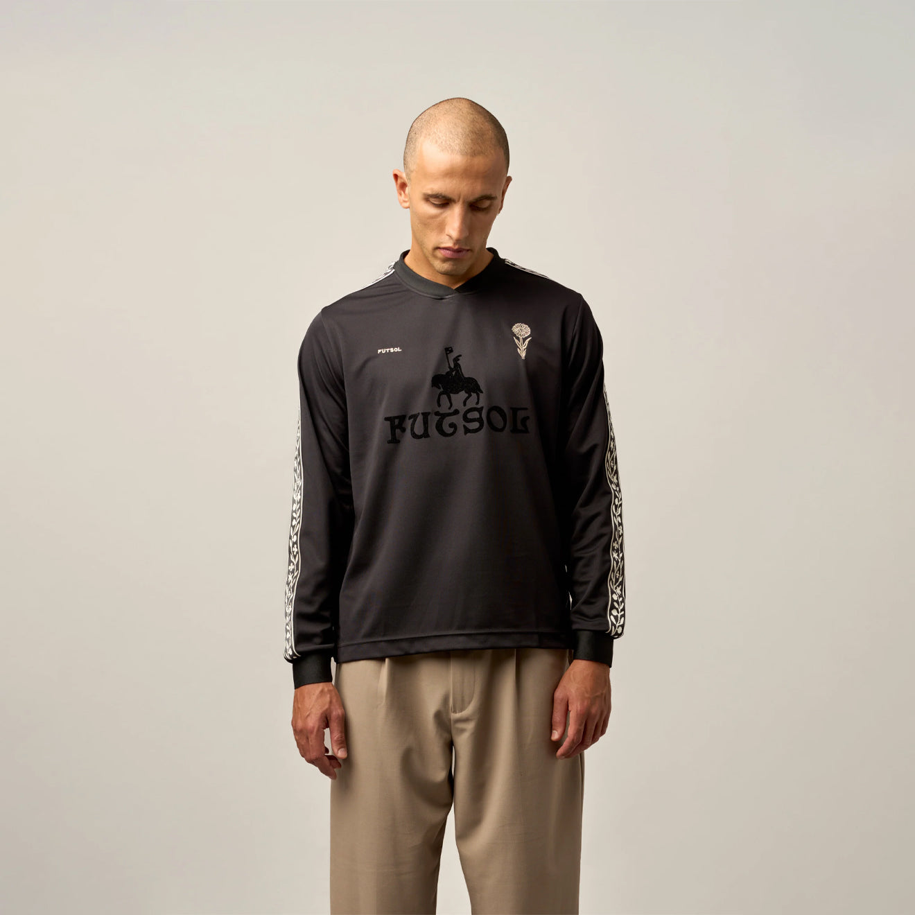 The Futsol Long Sleeve Jersey in Black Horse draws inspiration from ancient folklore and English heritage. The central crest nods to the legendary Uffington White Horse, reimagined here mid-celebration, while floral sleeve tape and natural motifs reference designs found in antique manuscripts. Merging history with modern craftsmanship, this jersey celebrates the game’s deep-rooted spirit with contemporary performance details.