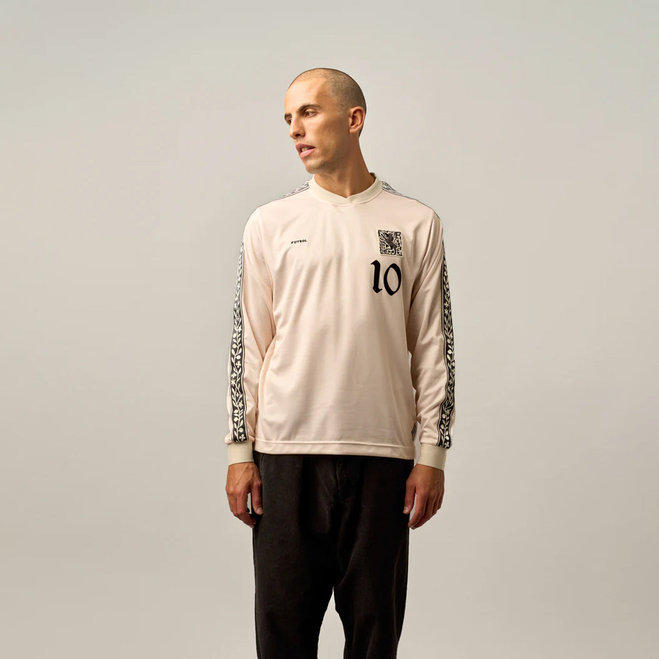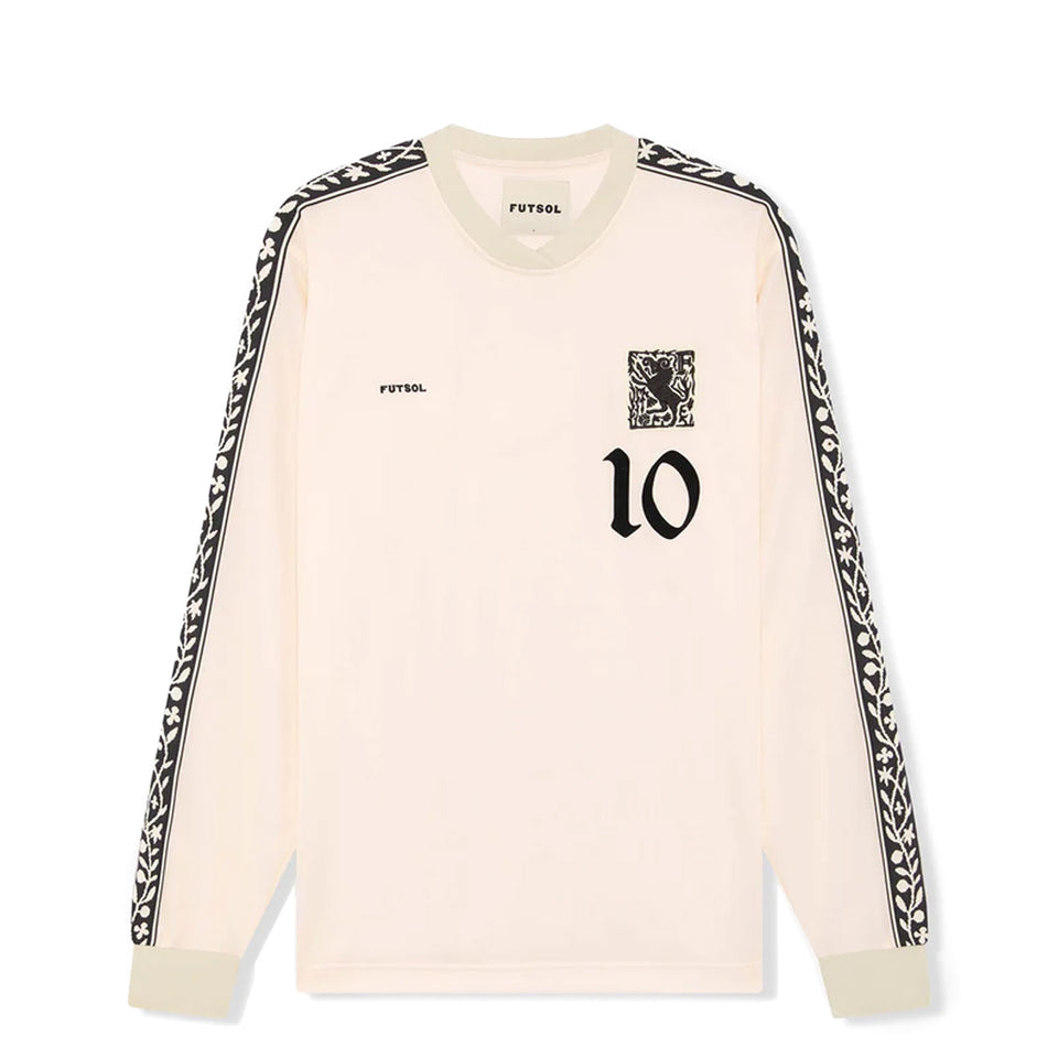 The Futsol Long Sleeve Jersey in Cream Ram takes its cues from British folklore and antique book design. The intricate stripe running down each sleeve is inspired by traditional book borders, featuring motifs of centaury flowers and autumnal berries. Above the number 10 sits a hand-drawn crest depicting the Derby Ram, a mythical creature celebrated in pagan culture — a true nod to the roots of the game.