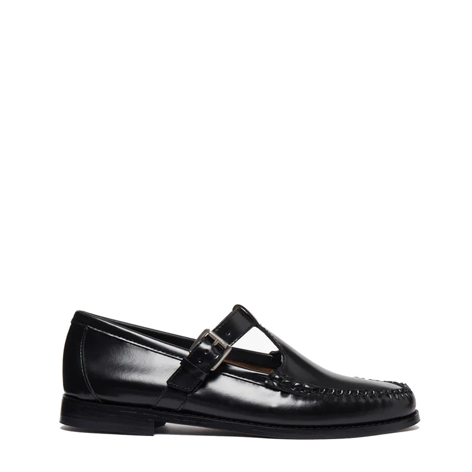 The G.H. Bass Women's Mary Jane in Black is crafted from premium black moc leather with a high-gloss polished finish. Featuring an antique silver-tone adjustable buckle and embossed gold-tone insock branding, this timeless design is expertly handsewn with tonal stitching. An ergonomic dual-density foam cushion and reinforced stacked heel provide superior comfort and support, while the durable handcrafted leather sole, complete with a bottom-sole brand logo, ensures lasting wear.