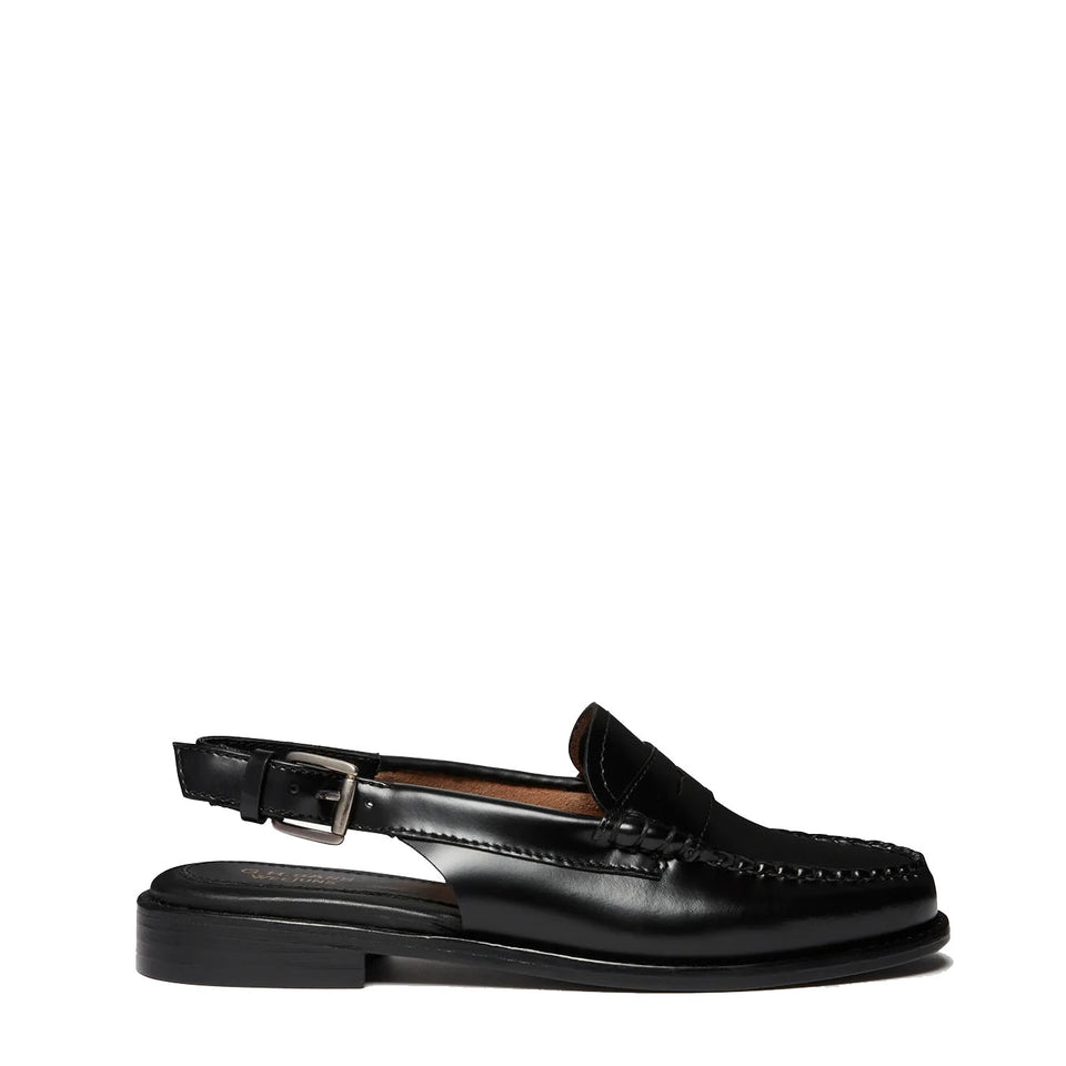 The G.H. Bass Women's Weejuns Penny Sling in Black Leather is a timeless loafer with a hand-polished finish and an adjustable buckle strap for a secure fit. Hand-sewn with tonal stitching, it features a breathable unlined design, cushioned insole, and a polished leather sole with an anti-slip rubber heel tap. Durable welt stitching ensures longevity, while the gold-embossed footbed adds a refined touch.