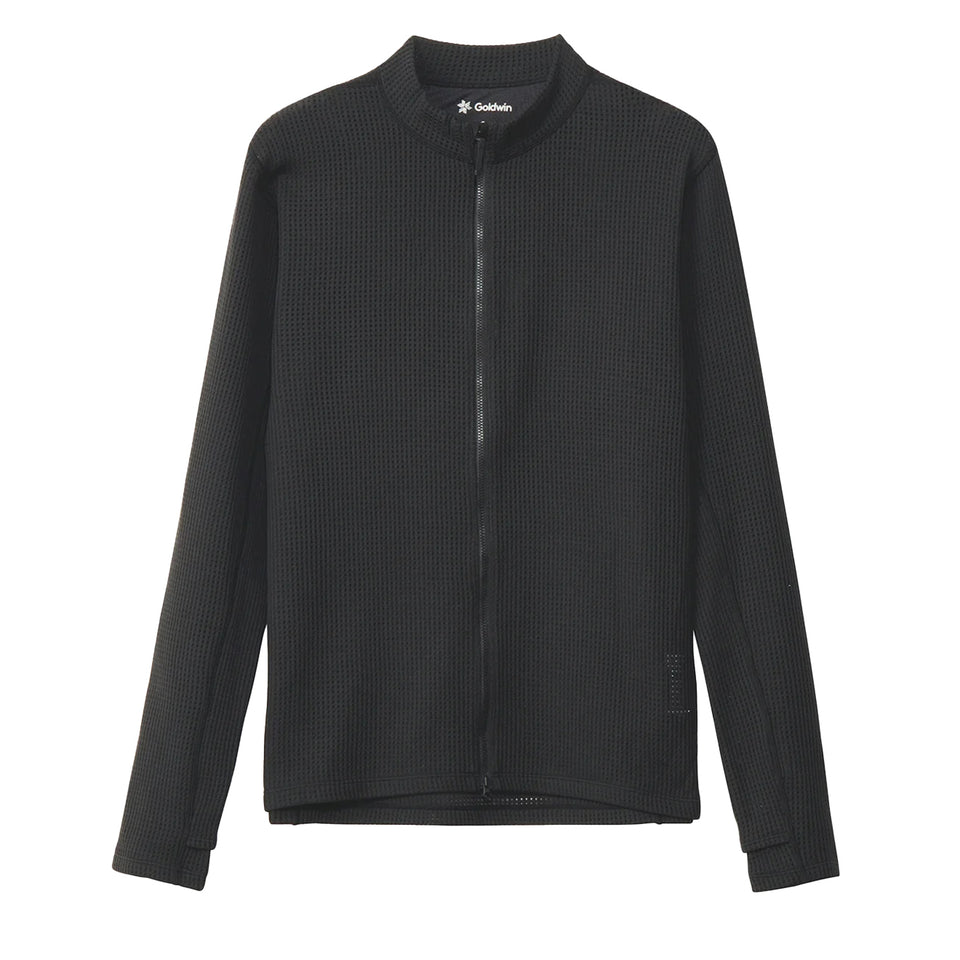 The Goldwin Dry Mesh Knit Jacket in Black is a comfortable midler jacket with excellent breathability and moderate heat retention. It is constructed with Polartec Power Dry fabric, featuring a double knit design that effectively wicks away sweat and maintains a comfortable microenvironment with its mesh structure.