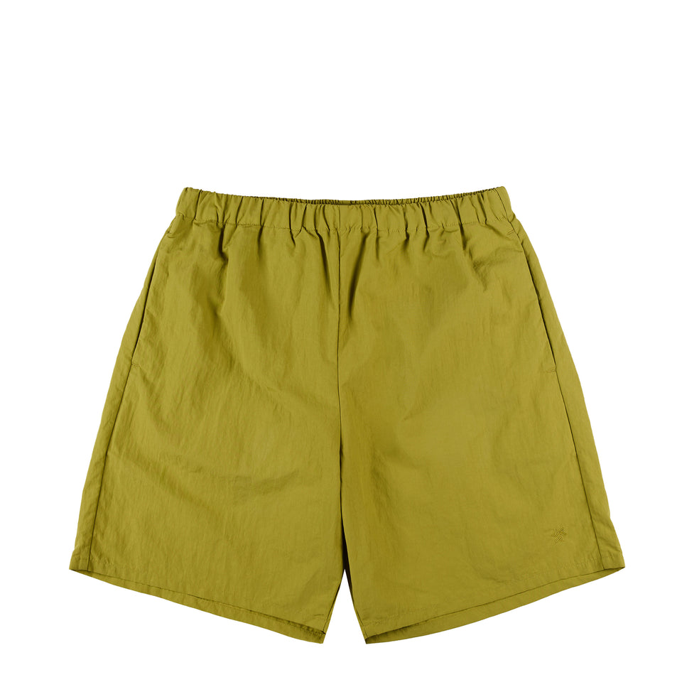 The Goldwin Nylon Shorts in Acid Oil are versatile and lightweight shorts designed for daily wear and active use on land or in water. Made from recycled nylon with a wrinkle-processed finish for a natural texture, they feature an 18cm inseam for better mobility and a relaxed silhouette for comfort. Details include an elastic waistband with drawcord, side seam pockets, a zippered rear pocket, and a hidden security pocket. With minimal stitching and sustainable materials, these shorts blend practicality with clean, functional design.