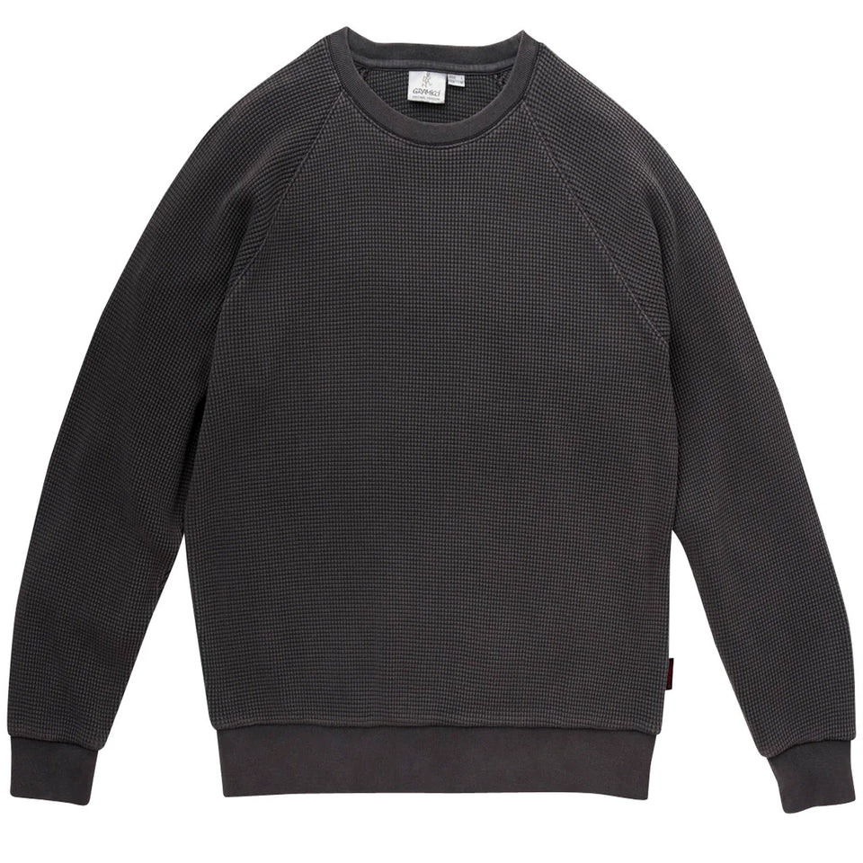 The Gramicci Waffle Crew in Pigment Black is a versatile crew neck sweatshirt made from flexible waffle-knit cotton yarn, offering comfort and warmth for layering on colder days. It features raglan sleeves for ease of movement and a pigment-dyed finish for a subtle, vintage-inspired look, combining practicality with timeless style.