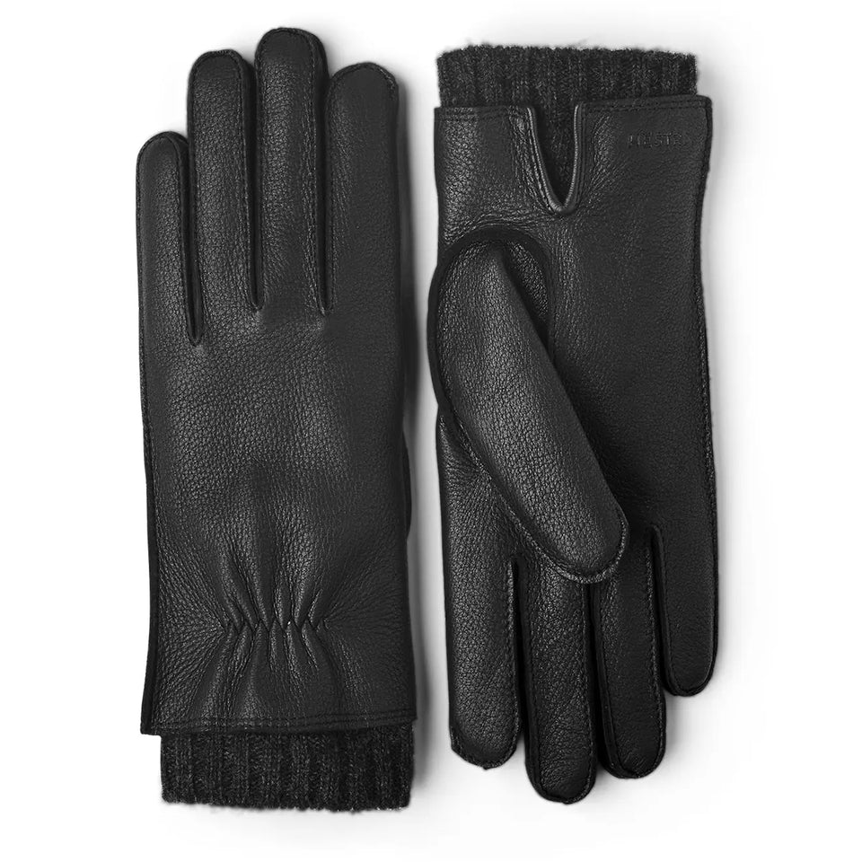 A classic women's glove crafted from leather, lined with soft knitted wool and featuring a supple deerskin for insulation. Decorative details such as the extended lining which doubles as a short cuff make this glove the perfect warming everyday accessory.
