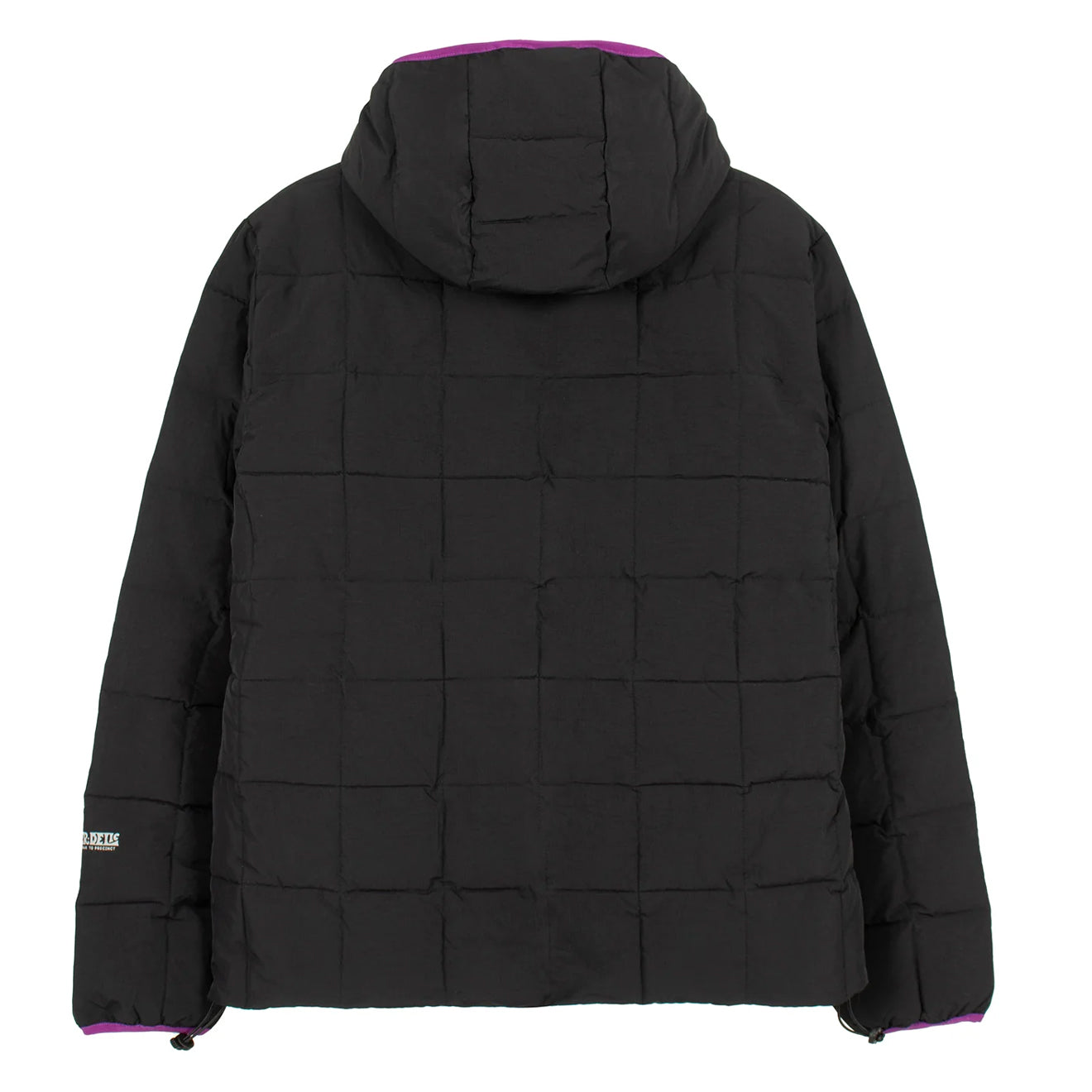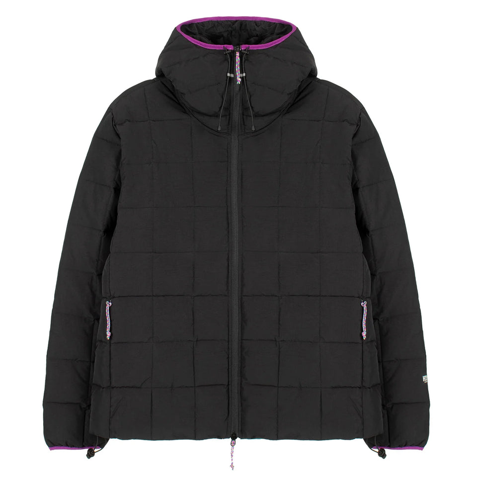 The Hikerdelic Coterie Quilted Jacket in Black is a cold-weather essential designed for warmth and style. Featuring stitched square baffles filled with recycled synthetic insulation, it offers protection against chilly mornings. Purple detailing on the adjustable hood and flecked paracord zip pullers add subtle contrast, while reflective branding on the sleeve ensures visibility.