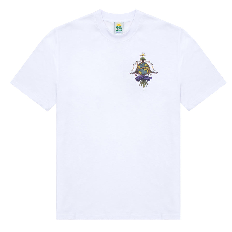 The Hikerdelic Kalpana T Shirt in White is a short sleeve tee made from premium, 100% Cotton with a classic crewneck. Featuring printed Hikerdelic graphic artwork branding on the chest on large print on the back.