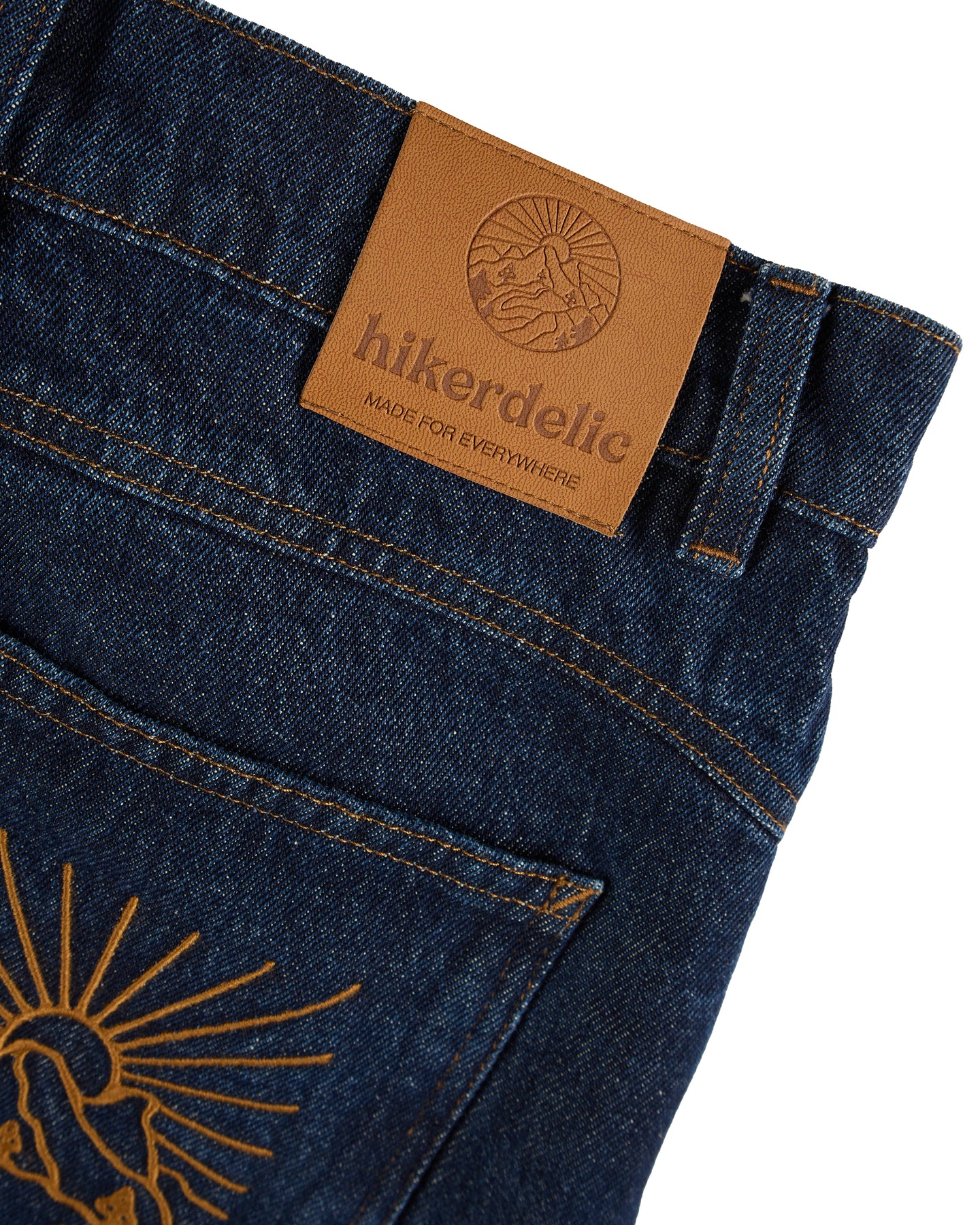 The Hikerdelic Mendelian Jeans in Indigo Blue are made from durable cotton with a clean zip fly for everyday use. A small landscape embroidery on the back pocket adds a subtle detail, with the “Made for Everywhere” motto stitched into the belt tab. Tough enough for the outdoors yet easy to wear day to day, they balance utility with simple style.