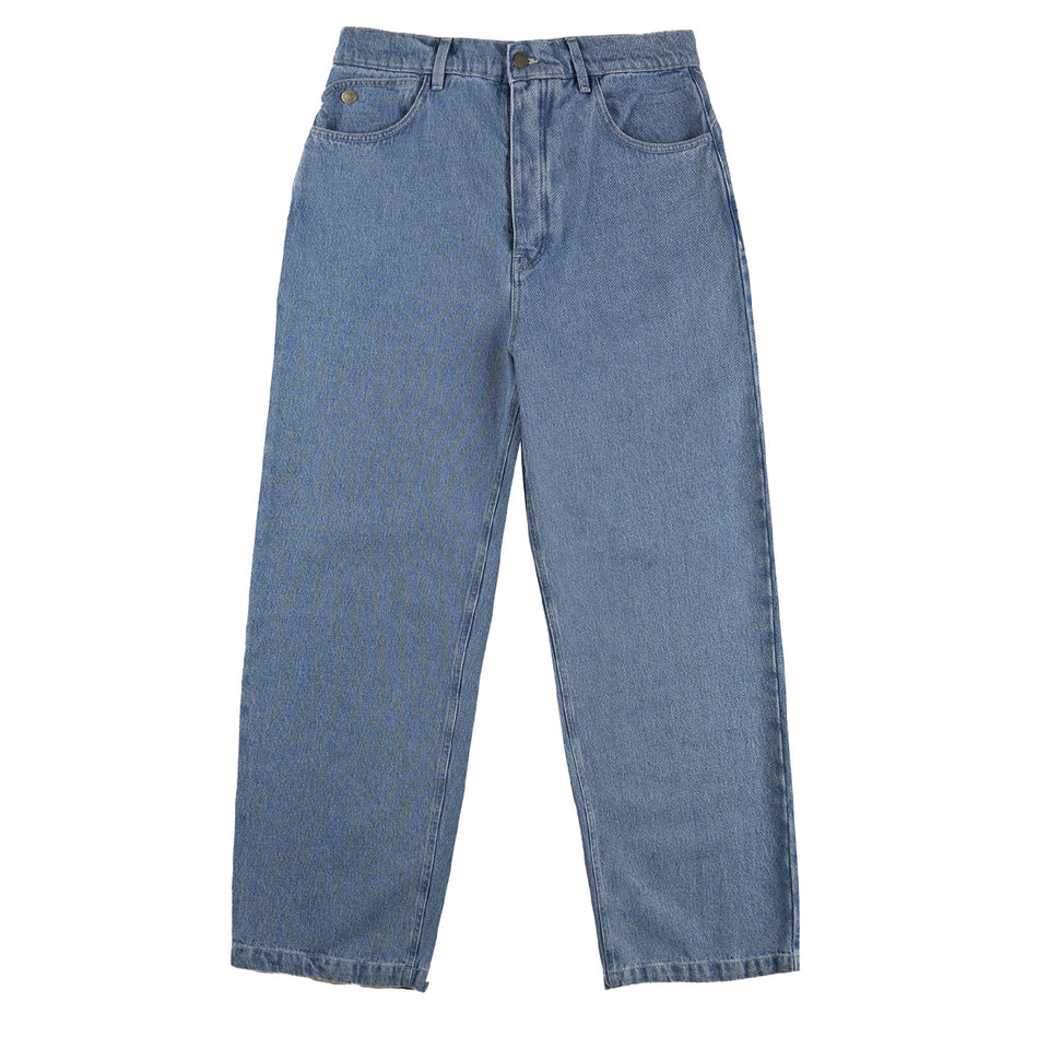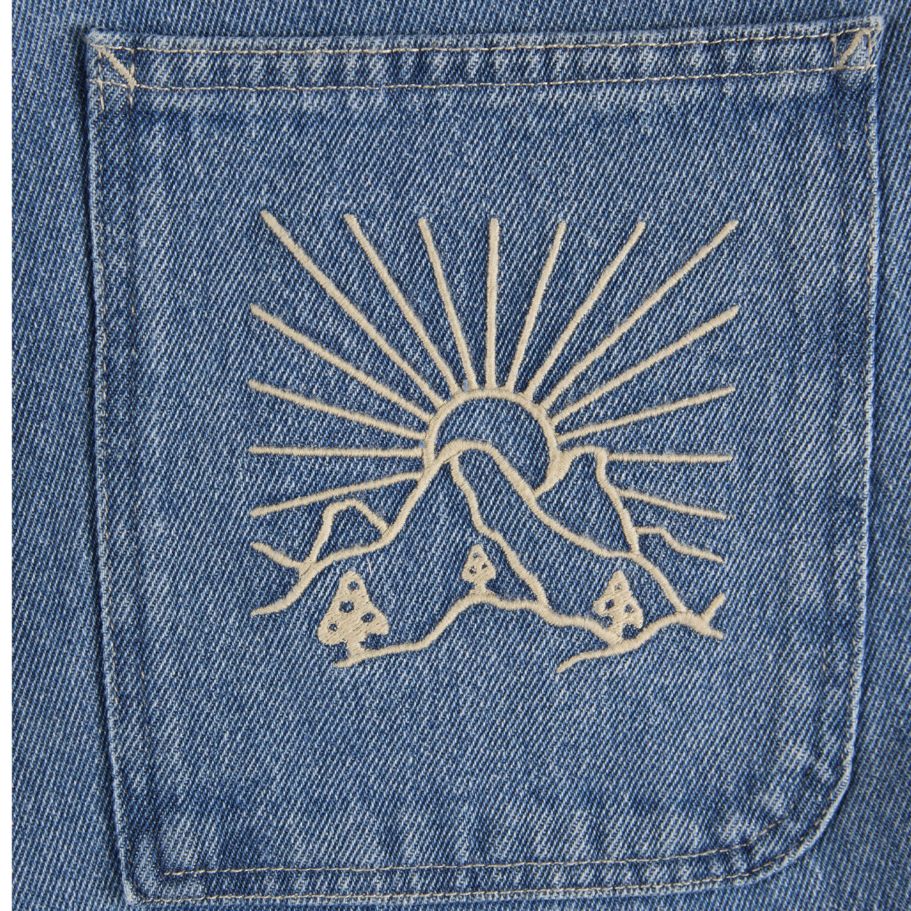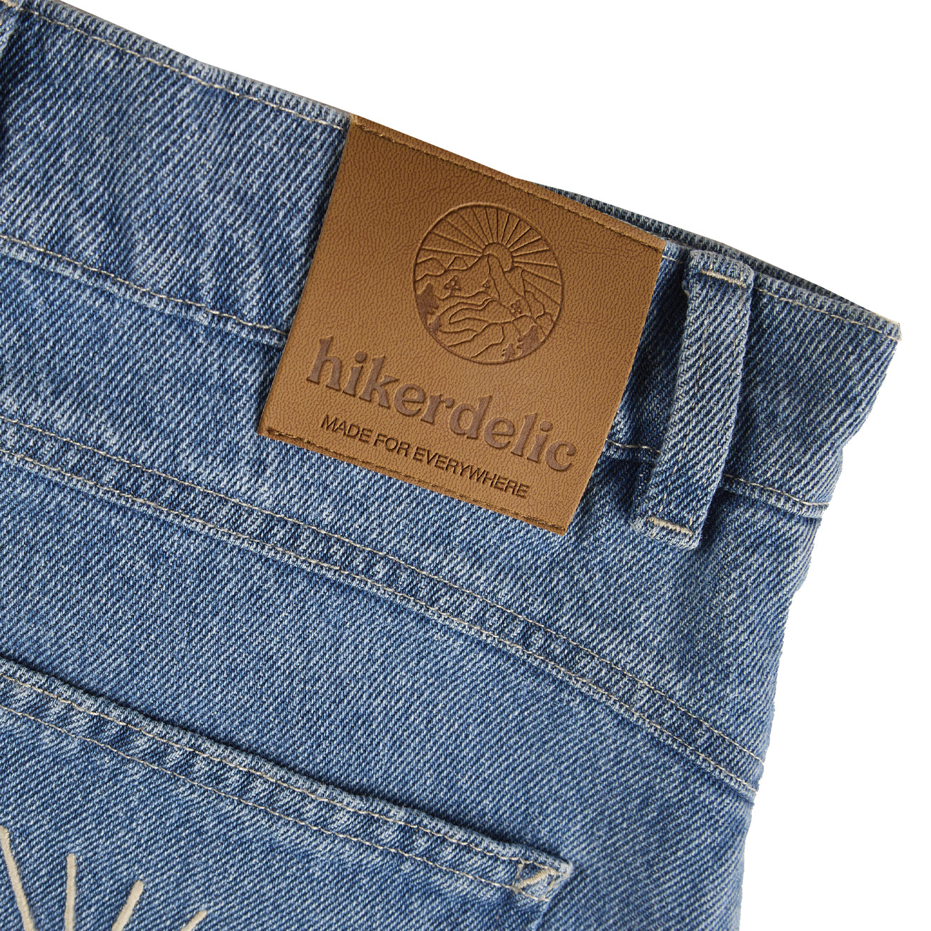 The Hikerdelic Mendelian Jeans in Washed Blue are made from durable cotton with a clean zip fly for everyday use. A small landscape embroidery on the back pocket adds a subtle detail, with the “Made for Everywhere” motto stitched into the belt tab. Tough enough for the outdoors yet easy to wear day to day, they balance utility with simple style.