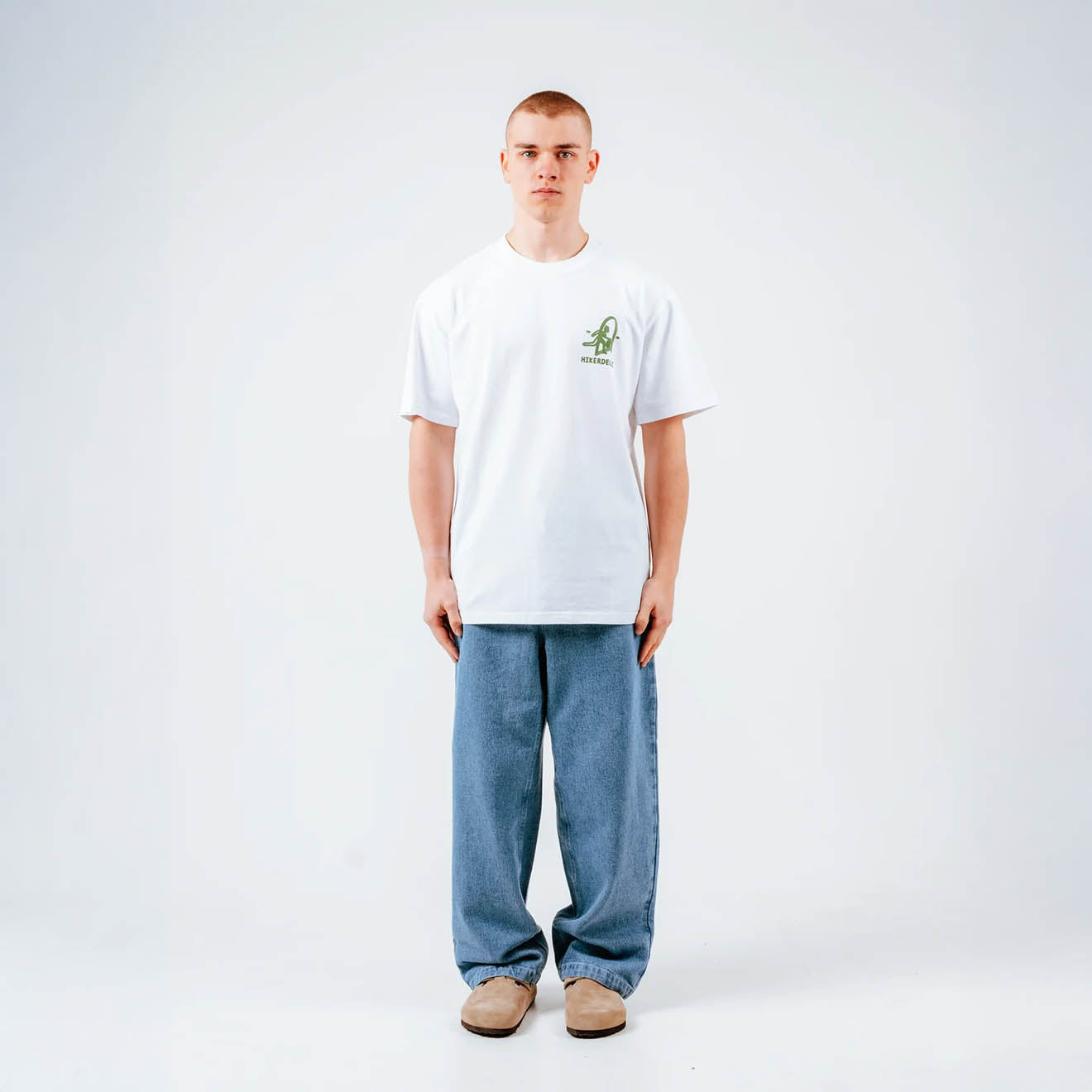 The Hikerdelic Out More SS T-shirt in White is a Summer 2025 design that revisits the 'Get out more' message, encouraging time in nature. Inspired by late 1960s protest posters, it features a refined, relaxed fit that is slightly more roomy than previous versions. Made from heavyweight cotton-viscose fabric, it combines comfort with durability for everyday wear.