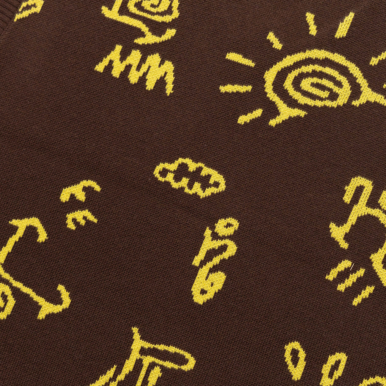 The Hikerdelic Petroglyph Knitted Vest in Sepia blends nostalgic folklore with a modern bold aesthetic. Featuring an all-over pattern of petroglyph-style lettering spelling "Hikerdelic," it draws inspiration from ancient stone carvings for a unique and culturally rich design. This vest is a standout layering piece perfect for transitional styling.