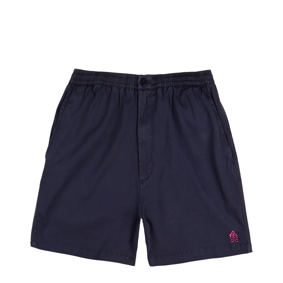 The Hikerdelic Strolling Shorts in Peacoat Navy are made for comfort and versatility. They feature a slight stretch and an adjustable waist for a relaxed fit. Fastened with a zip, button, and drawstring, they include practical pockets and a subtle Hikerdelic motif for a simple finishing detail.