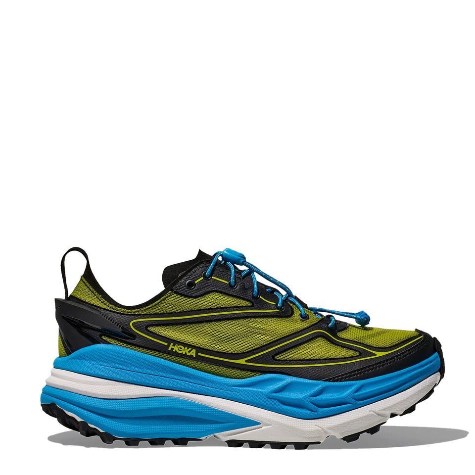 The Hoka Stinson 7 Trainer in Black and Skyward Blue blends trail performance with everyday wear, offering a stable and comfortable feel underfoot. Designed to move easily between outdoor routes and daily use, it combines supportive cushioning with a lightweight build. Practical details and a distinctive upper give it a considered look without sacrificing function.