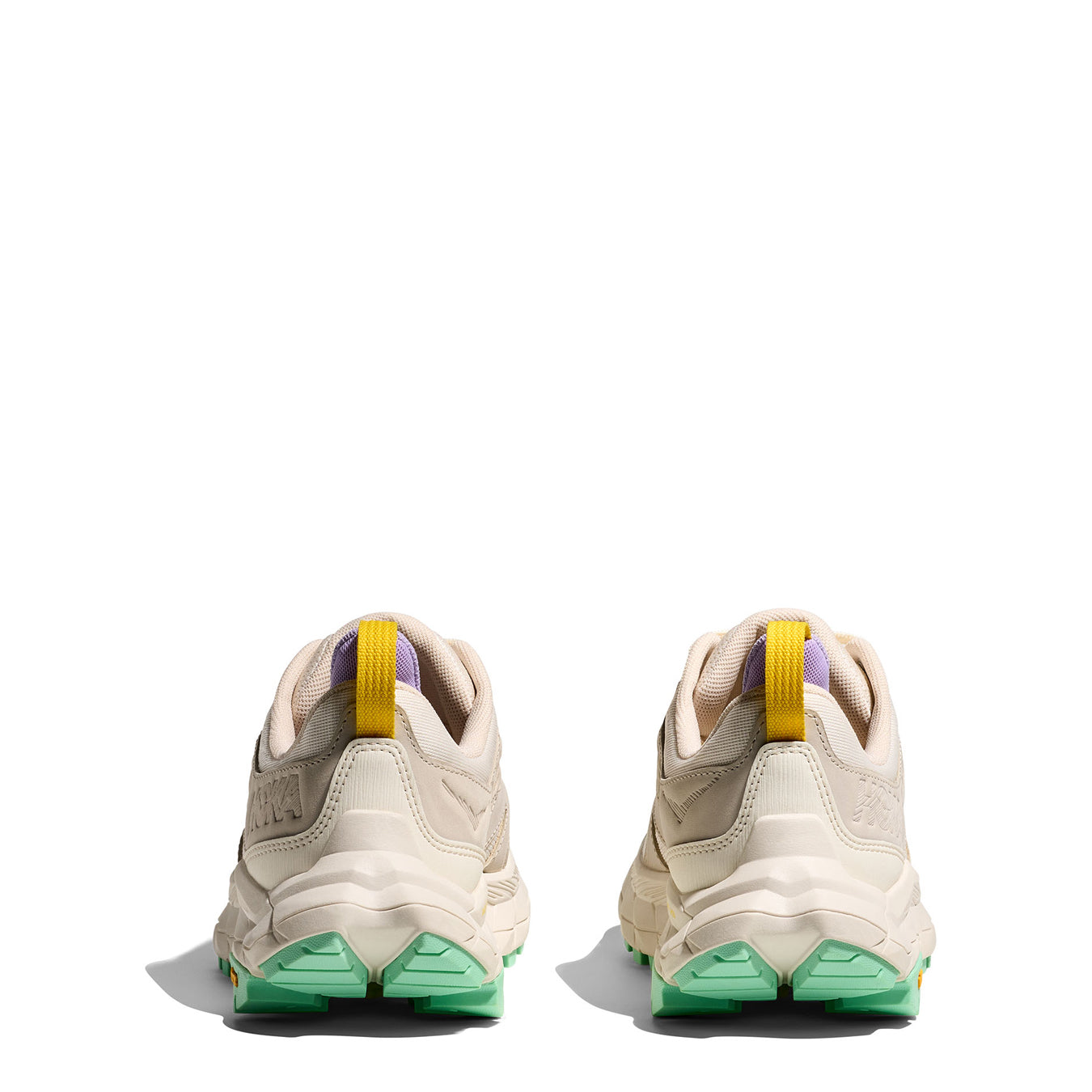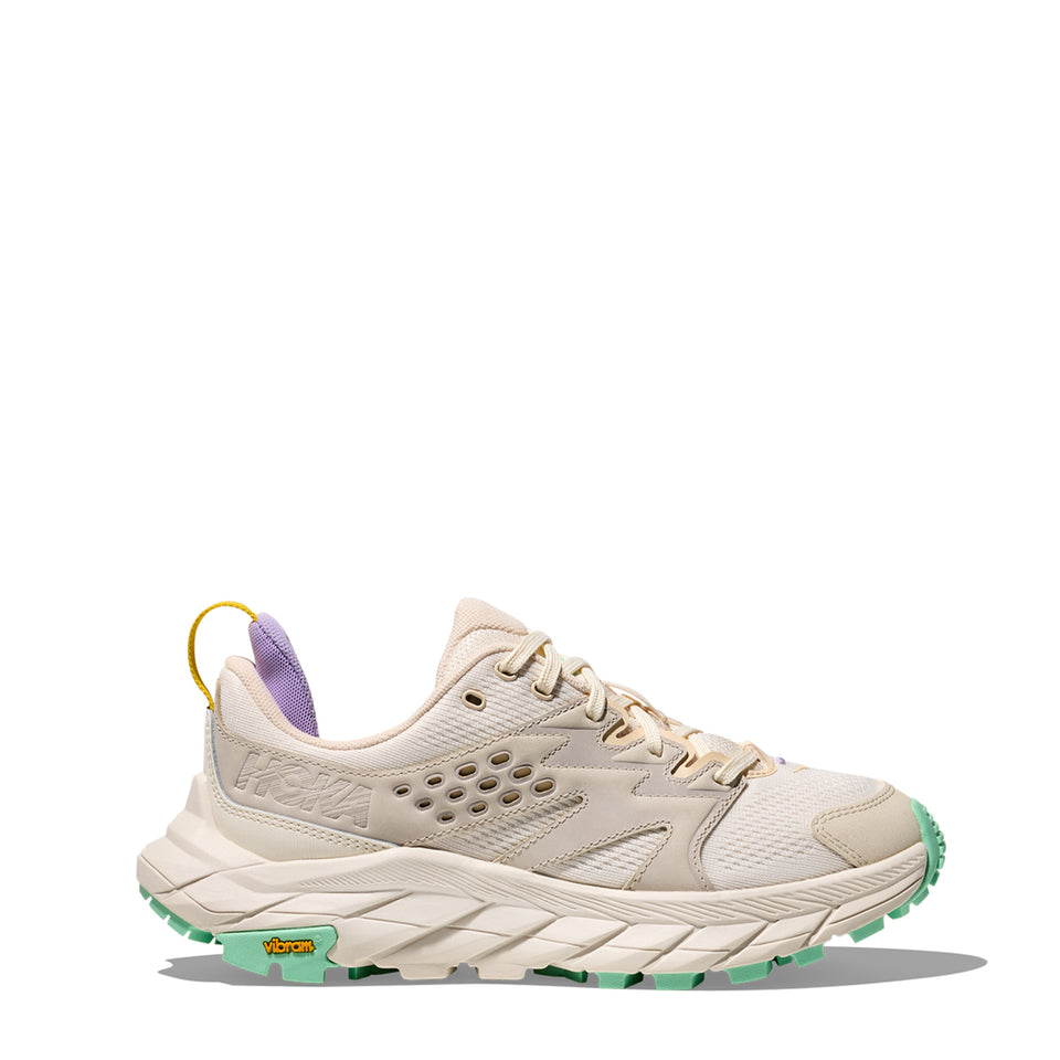 The Hoka Women's Anacapa Breeze Low Trainer in Alabaster/Mint Fluorite is a lightweight, breathable hiker built for warm-weather adventures. Its jacquard mesh upper, made from 100% recycled rPET fabric, ensures ventilation, while a CMEVA midsole delivers cushioned comfort. A Vibram® MegaGrip outsole with 5mm lugs provides reliable traction, and the extended heel geometry enhances stability. With a reinforced shell, padded collar, and secure lacing system, it’s ready for any trail.