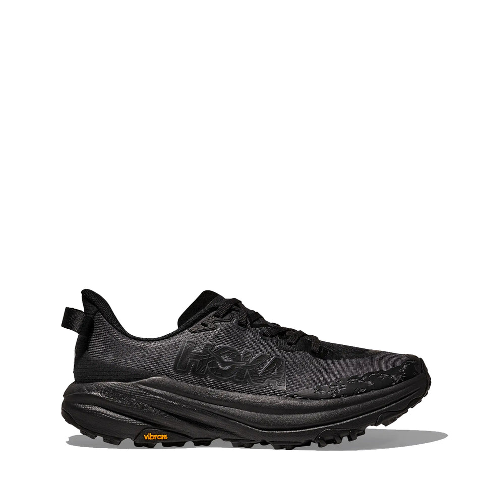 The HOKA Women's Speedgoat 6 Trainer in Black/Black is built for a grippy, responsive ride on technical terrain. Designed to tackle the toughest trails, it combines HOKA’s signature cushioning with aggressive traction and ultralight materials. This latest version features a breathable woven textile upper, a foot-hugging internal chassis, and a plusher dual-gusset tongue for enhanced comfort. The revised lug pattern, inspired by a goat’s hoof, ensures superior grip, making it the ultimate trail-running workhorse.