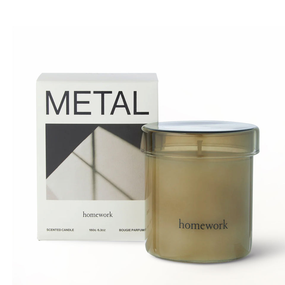 The Homework 'Metal' Candle blends citrus, wood, metallic accords, and black pepper to create a bold, modern scent.