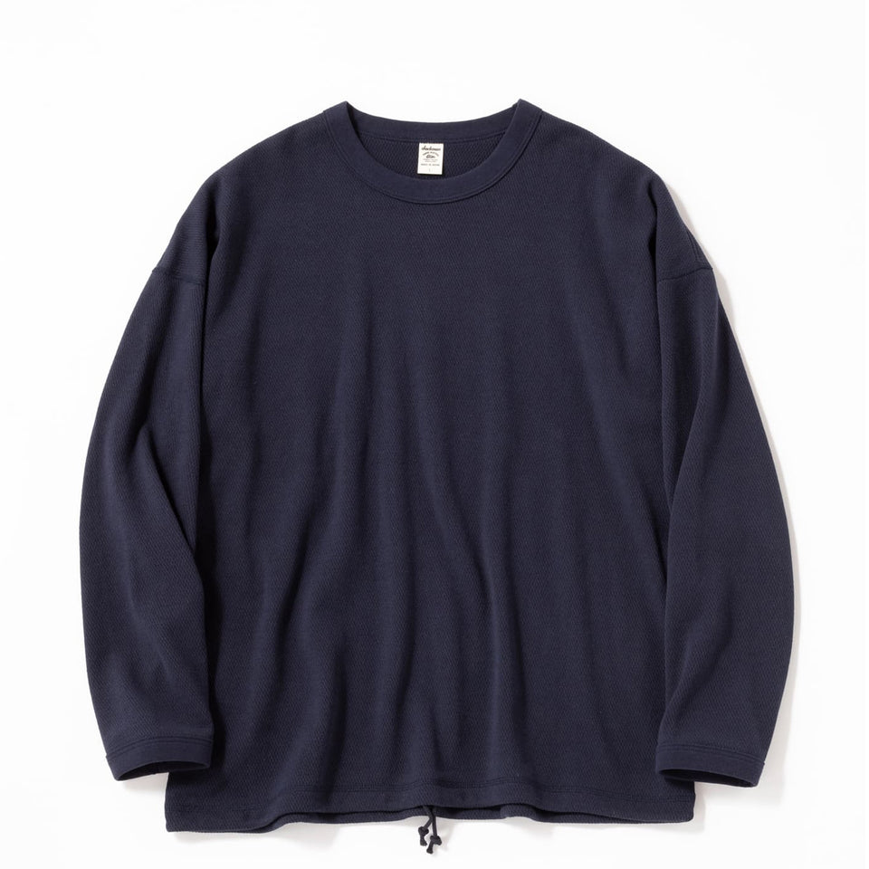 It is made from honeycomb-structured thermal knit using 26/2 air-spun yarn at a slightly higher gauge, giving the fabric a crisp, textured feel and subtle volume.