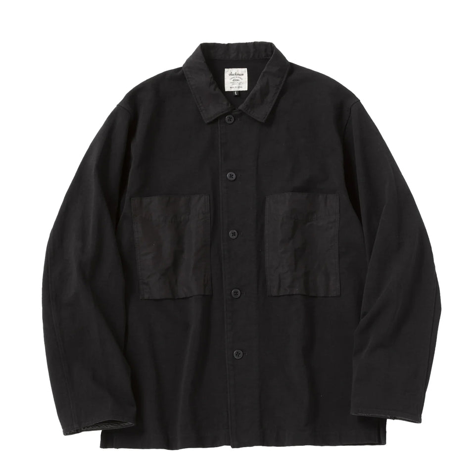 The Jackman Dotsume BB Shirt in Black is a premium heavyweight shirt made from dense 11.5 oz. American cotton, offering exceptional durability and structure. Crafted on a traditional loop-wheel knitting machine, it features a tight stitch count for a rich, textured feel. Inspired by vintage baseball uniforms, this shirt includes contrasting fabric on the collar and pockets, adding a nostalgic, athletic touch. With its blend of Japanese craftsmanship and heritage design, the Jackman Dotsume BB Shirt is a timeless, high-quality wardrobe essential. Perfect for those seeking rugged style with authentic vintage appeal.