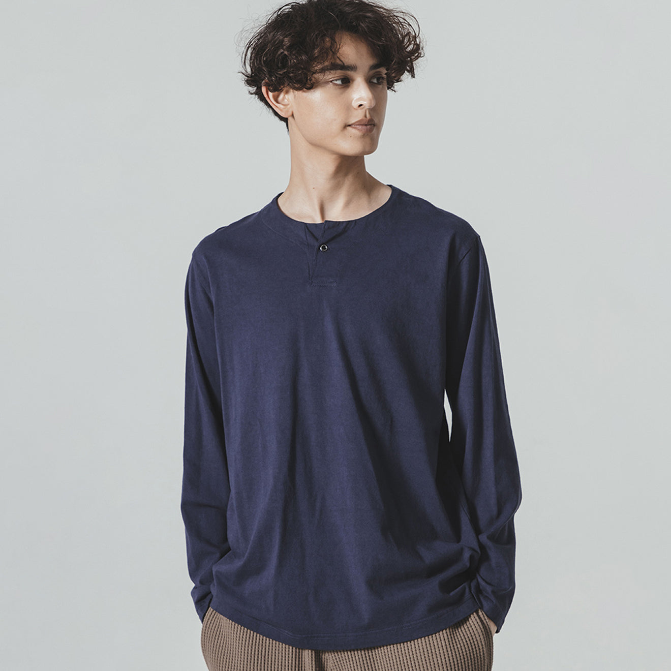 The Jackman Henleyneck Long Sleeve T-Shirt in Classic Navy is made mainly from USA cotton grown in the Mississippi River Basin. Air-spun yarn gives the fabric a crisp texture and a slightly rough feel.