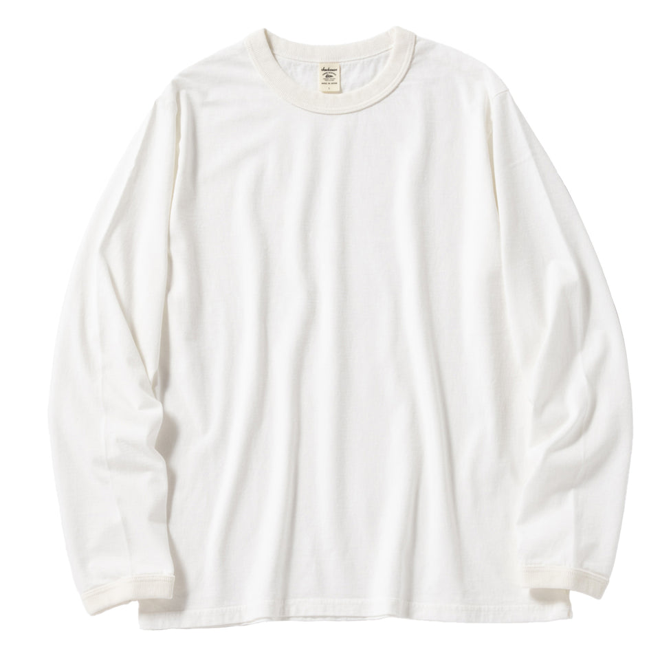 The Jackman Lead-Off LS T-Shirt in White is a premium long sleeve tee made in Japan from high-quality air-spun cotton sourced from the U.S. This unique fabric delivers a crisp texture and breathable comfort, perfect for year-round wear. It features a three-roll binding neck, side slits for mobility, and a clean, pocketless design. With stretch-resistant milling at the collar, this shirt maintains its shape over time, making it a timeless and durable addition to your wardrobe.