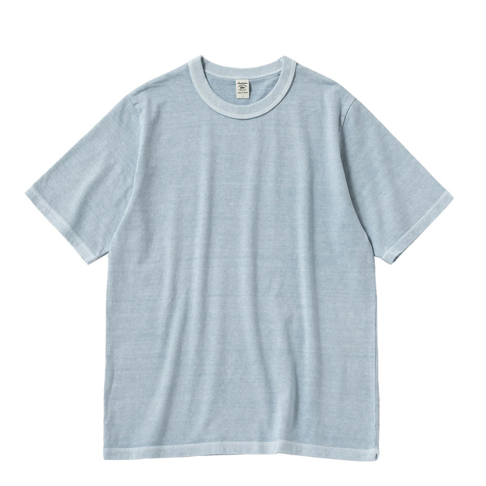 The Jackman Lead-Off T-Shirt in Fade Saxe is a premium short sleeve tee made in Japan from high-quality air-spun cotton sourced from the U.S. This unique fabric delivers a crisp texture and breathable comfort, perfect for year-round wear. It features a three-roll binding neck, side slits for mobility, and a clean, pocketless design. With stretch-resistant milling at the collar, this shirt maintains its shape over time, making it a timeless and durable addition to your wardrobe.