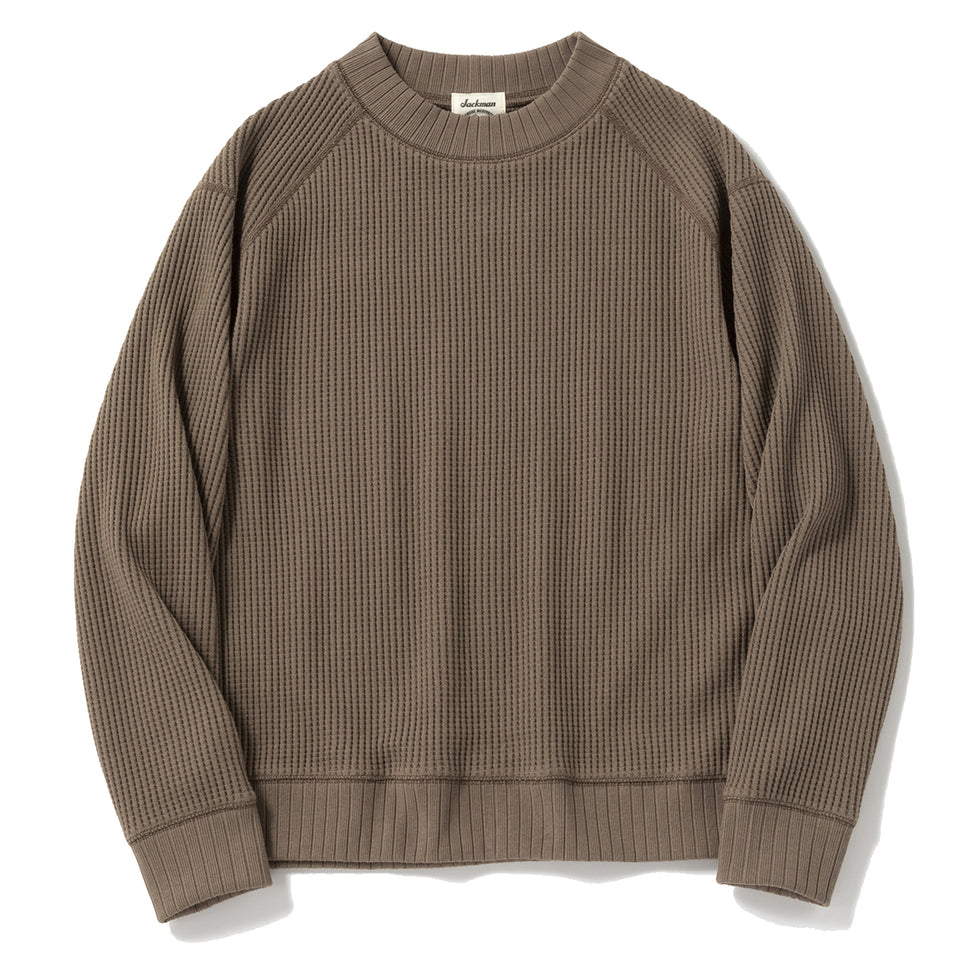 The Jackman Waffle Mid-Neck Taupe is made using a unique method using extra-thick thread. It's made with a soft and voluminous big waffle material that's knitted using a special machine that knits slowly at low speed. The main sewing on the body is flat seam, which creates a flat seam allowance. The sewing part on the skin side is flat, making it very comfortable to wear. The back is switched horizontally to prevent the fabric from sagging. Due to the characteristics of the material, the fabric tends to stretch during the sewing process, so lower the sewing machine speed and sew carefully. Since it's made of cotton, it doesn't generate static electricity and can be washed at home. It's a product packed with ingenuity to ensure that it can be worn for a long time.