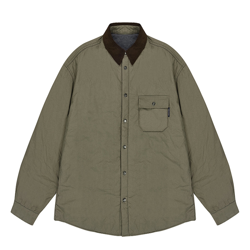 The Kappy Padding Shirt Jacket in Beige is a versatile padded shirt jacket suitable for outer or inner layering. It features a corduroy neck collar for a vintage-inspired touch and uses cotton filling for lightweight warmth and excellent insulation.