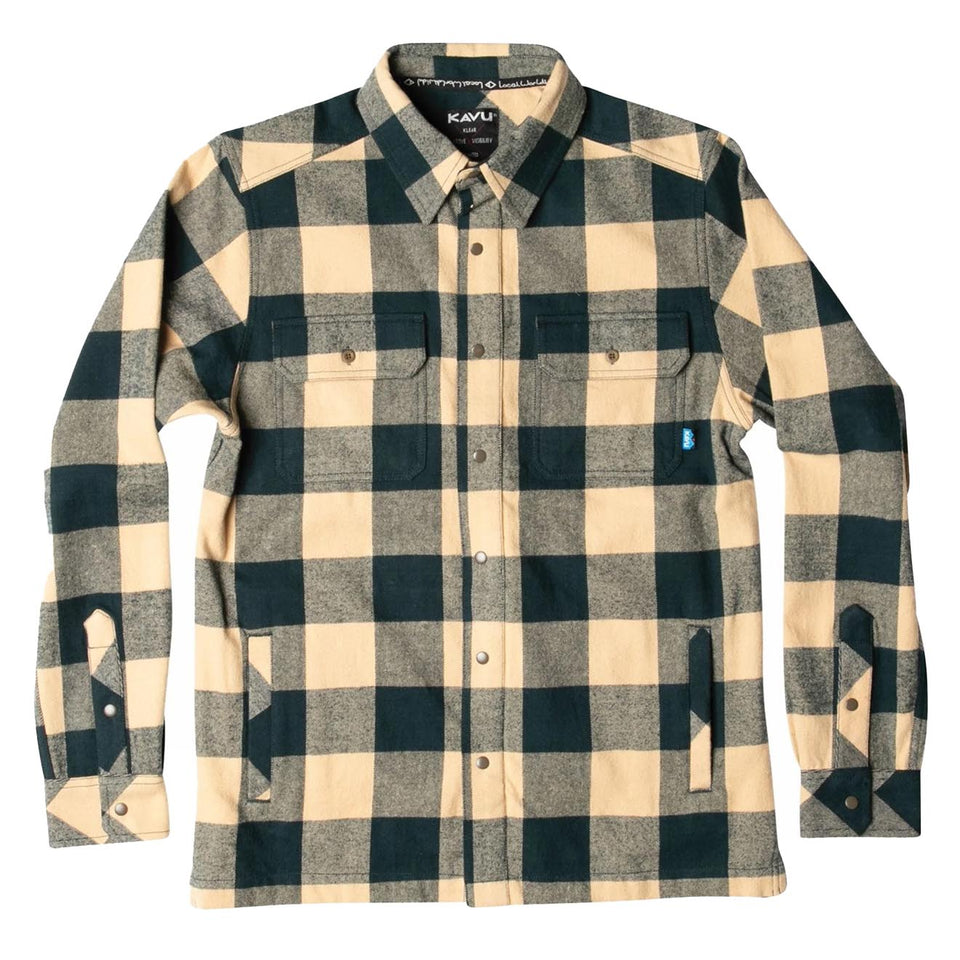Casual fit, shirt jacket with snap front, stand collar with interior KAVU logo jacquard tape, two chest flap pockets, single welt hand pockets, jersey lined cuffs, split back bias yoke, straight hem with side vents.