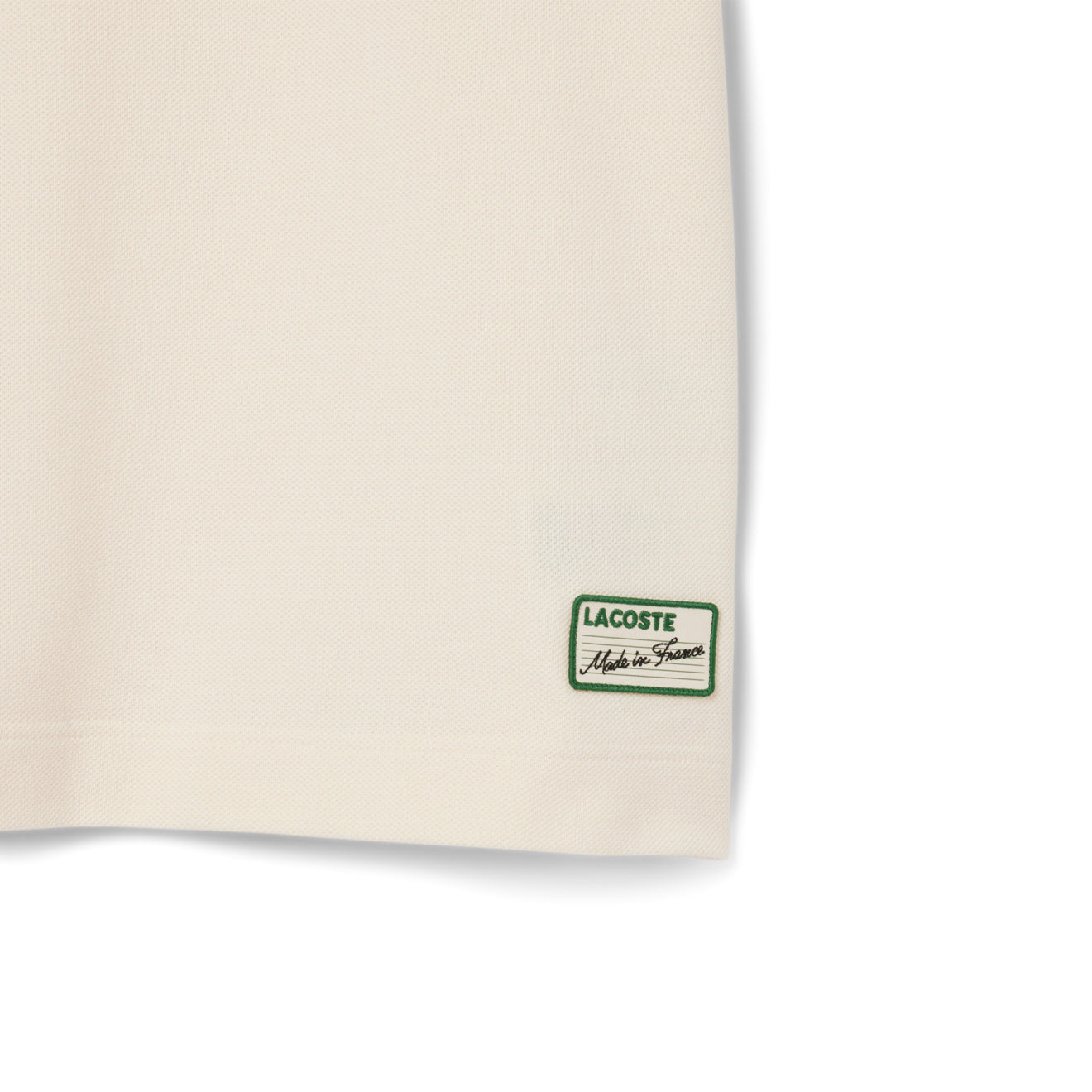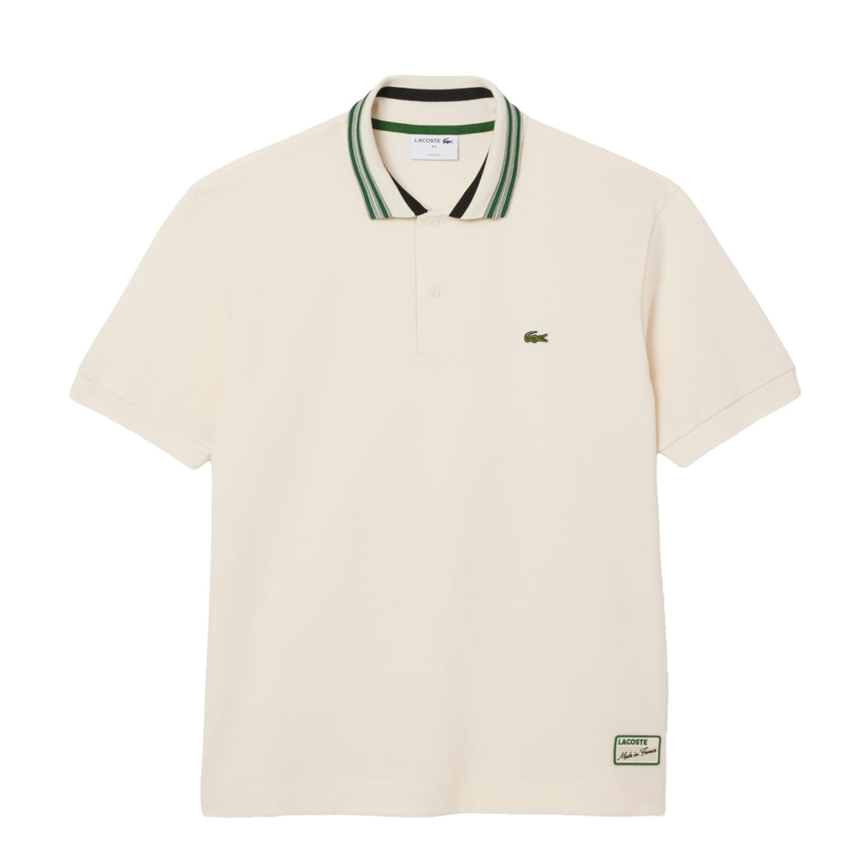 The Lacoste French Made Classic Fit Stripe Collar Polo Shirt in Ecru White is crafted in France from heavyweight organic cotton piqué for breathability and comfort. It features a contrast striped collar with subtle knit detailing, finished with a Made in France badge and embroidered crocodile for a timeless, refined look.