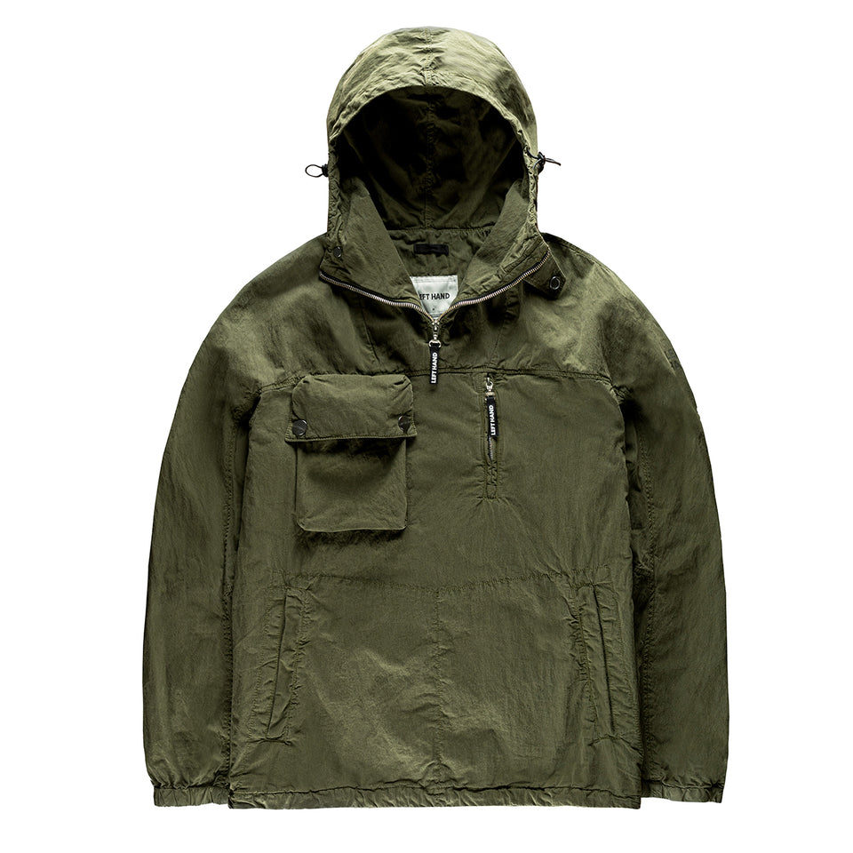 The Adda Smock is an overhead jacket inspired by Swiss Military wear, featuring oversized and concealed pockets, finished with branded zip pull and snap closures. The side zip and neck fastening allow easy access. Crafted from an organic cotton and Nylon mix for a soft handle, garment dyed and finished in Italy. This quality piece features stitching detail throughout, and is signed off on the left sleeve with an embroidered tonal logo