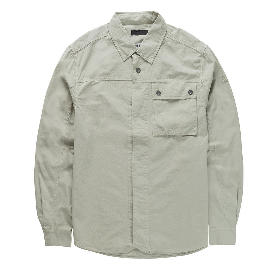 reactive garment-dyed with gots, OCS & OEKO-TEX100-certified dye house contrast fabrics mid-weight shirt (can be used as base or mid-layer) hidden metal button front placket, pointed collar, cuffs with buttons, LHS chest pocket with dual button fastening, internal hanging loop, bar tacks on cf placket, tone left-hand branding on LHS sleeve