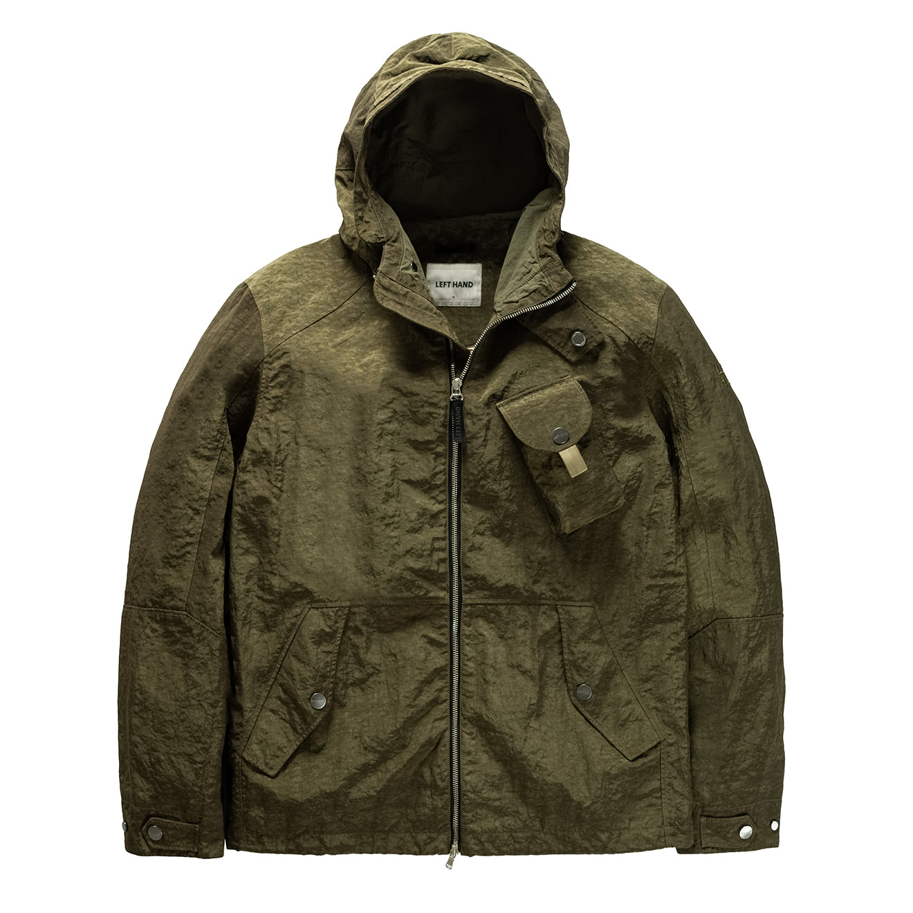 Hooded Anorak crafted from GRS certified 100% recycled Nylon, inspired by Canadian MK-II field jacket. Features tonal Left Hand branding on the sleeve, zip front with branded recycled zip pullers and snap adjustable cuffs. This anorak, in typical Left Hand fashion, is garment-dyed in Italy to increase texture. This piece is an excellent example of how Left Hand continues to reinvent classic staples with unique touches and design features.
