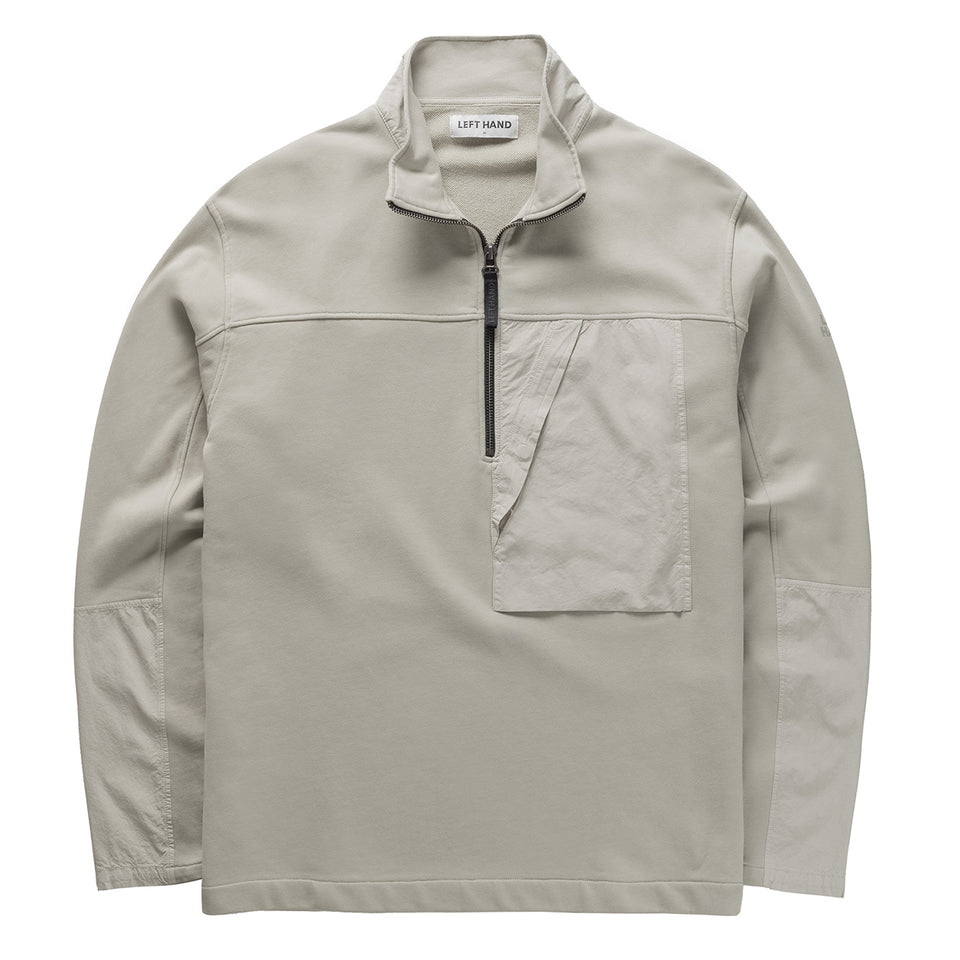 The half zip sweat has been garment dyed in a 340gsm 100% organic cotton loopback sweat. It features cotton ripstop panels and patch pocket with snap entry. Small tonal logo to the LHS sleeve. Regular fit.