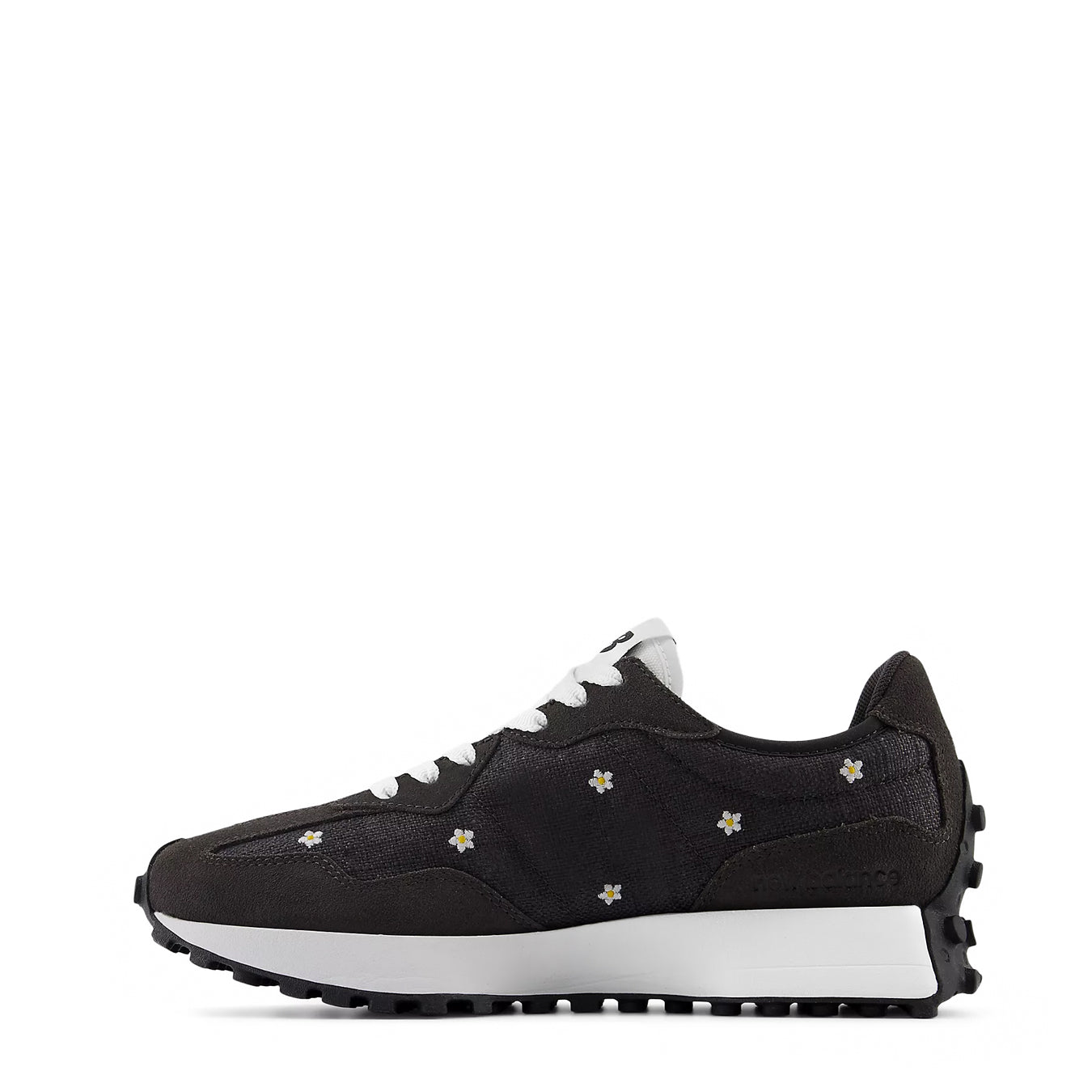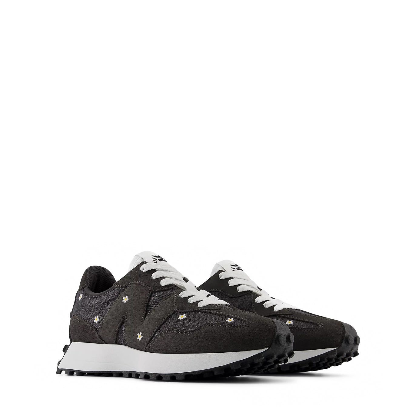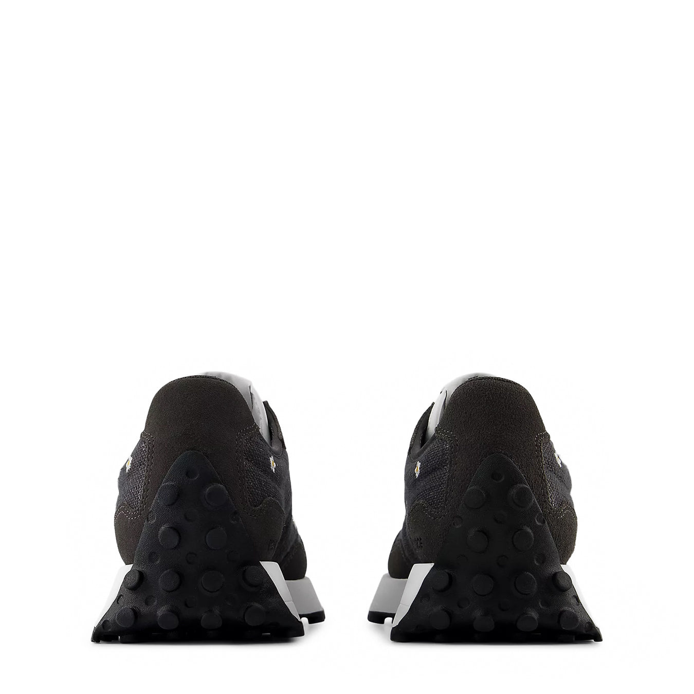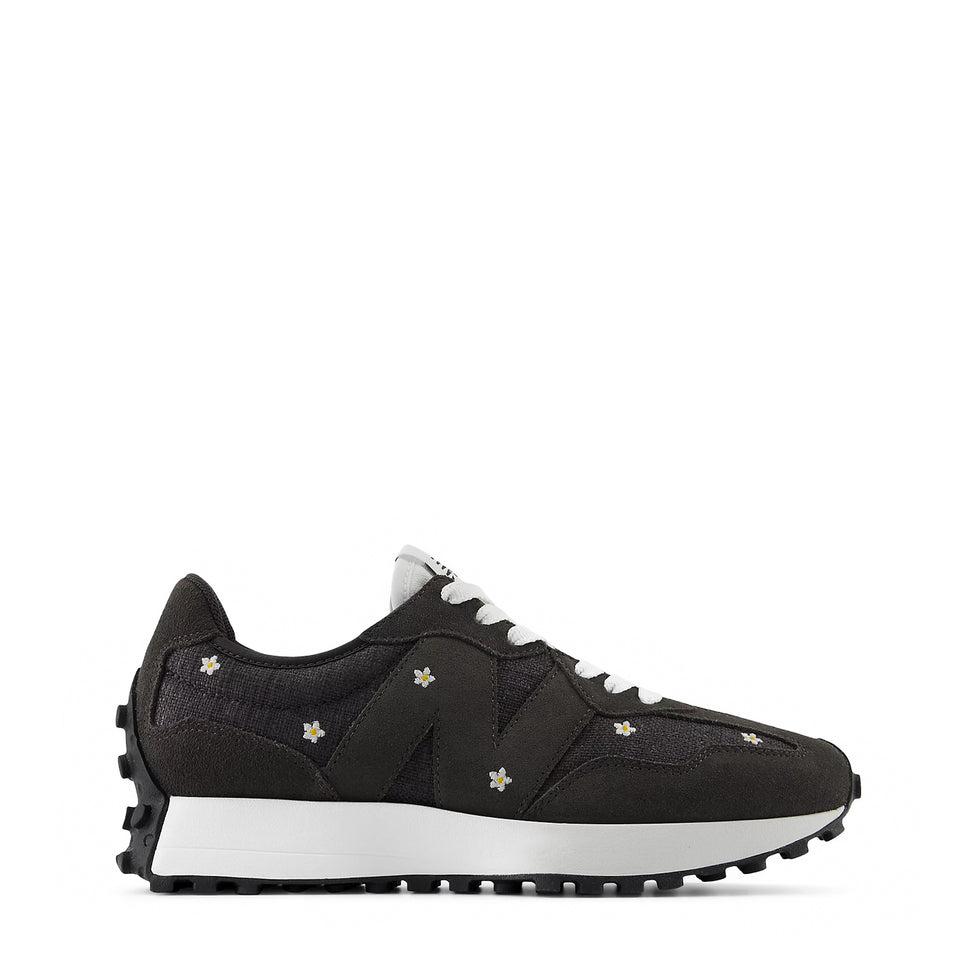 The New Balance Women's 327 Trainer in Black Cement / White reinterprets the classic styles of the 1970s with a modern twist. This trainer features an angular design based on the traditional wedge silhouette, oversized asymmetrical ‘N’ branding, and a wraparound, trail-inspired lug outsole. With its bold aesthetics and performance-driven features, the 327 is a stylish reimagining of running heritage, perfect for both casual wear and athletic pursuits.