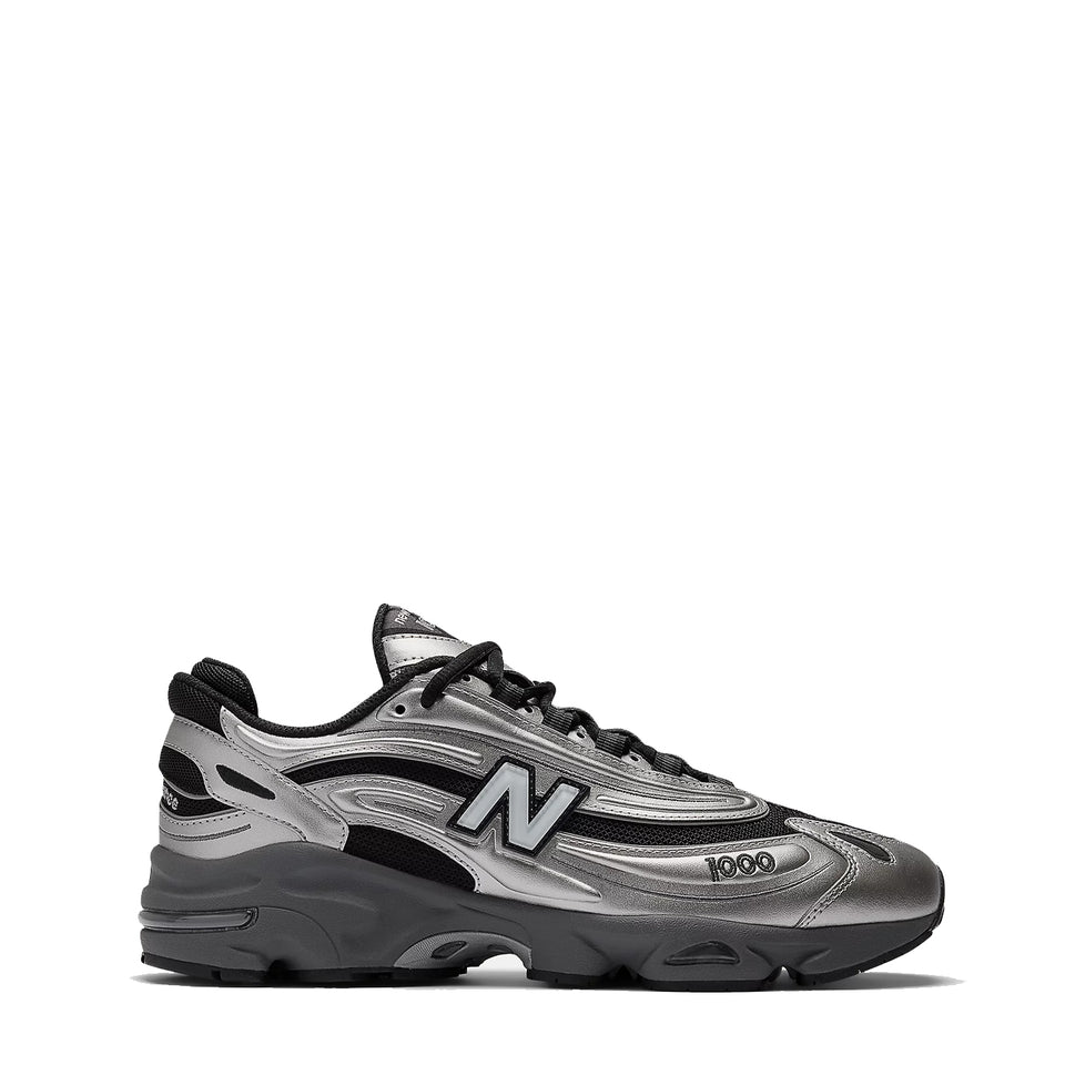 The New Balance Women's M1000 Trainer in Silver Metallic/Green revives a late ‘90s classic with a bold, retro-futuristic design. Featuring a sleek black mesh underlay and glossy silver metallic overlays, this chunky sneaker makes a statement. A shiny "N" logo on the quarter enhances the stylish look, while additional branding appears on the toe and heel. Built for both comfort and stability, the exaggerated polyurethane midsole incorporates ABZORB cushioning for impact protection, and the segmented rubber outsole includes a Stability Web plate for arch support.